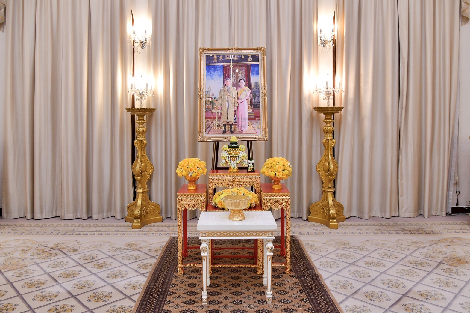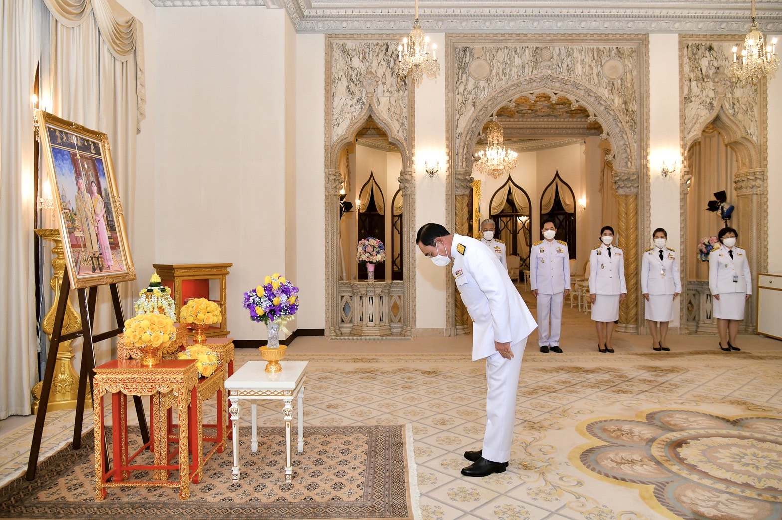 ที่ห้องสีงาช้าง ตึกไทยคู่ฟ้า ทำเนียบรัฐบาล พระบาทสมเด็จพระเจ้าอยู่หัว และสมเด็จพระนางเจ้าฯ พระบรมราชินี พระราชทานแจกันดอกไม้ แก่ พล.อ.ประยุทธ์ จันทร์โอชา