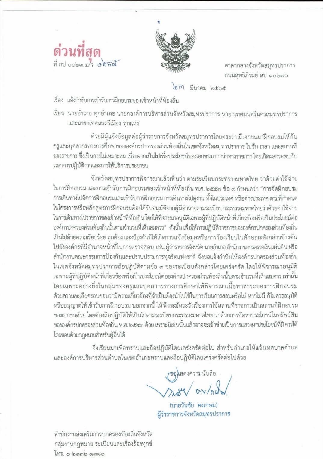ส่วนประเด็นกฎหมายที่ผู้ว่าราชการจังหวัดสมุทรปราการกล่าวอ้าง เป็นการอ้างอย่างผิดฝาผิดตัว องค์กรปกครองส่วนท้องถิ่น มีความเป็นอิสระเรื่องการบริหารงานบุคคล ใช้ดุลยพินิจเลือกจัดอบรมบุคลากรในสังกัดได้ หากเกี่ยวกับการพัฒนา หรือเพิ่มประสิทธิภาพในการปฏิบัติงานตามอำนาจหน้าที่