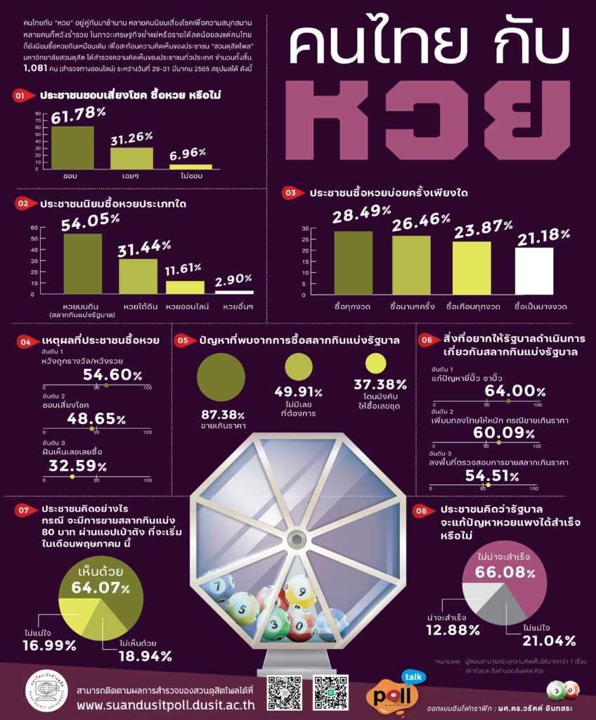 สวนดุสิตโพล มหาวิทยาลัยสวนดุสิต สำรวจความคิดเห็นของประชาชนทั่วประเทศ จำนวน 1,081 คน เรื่อง คนไทยกับ “หวย” ระหว่างวันที่ 29-31 มีนาคม 2565