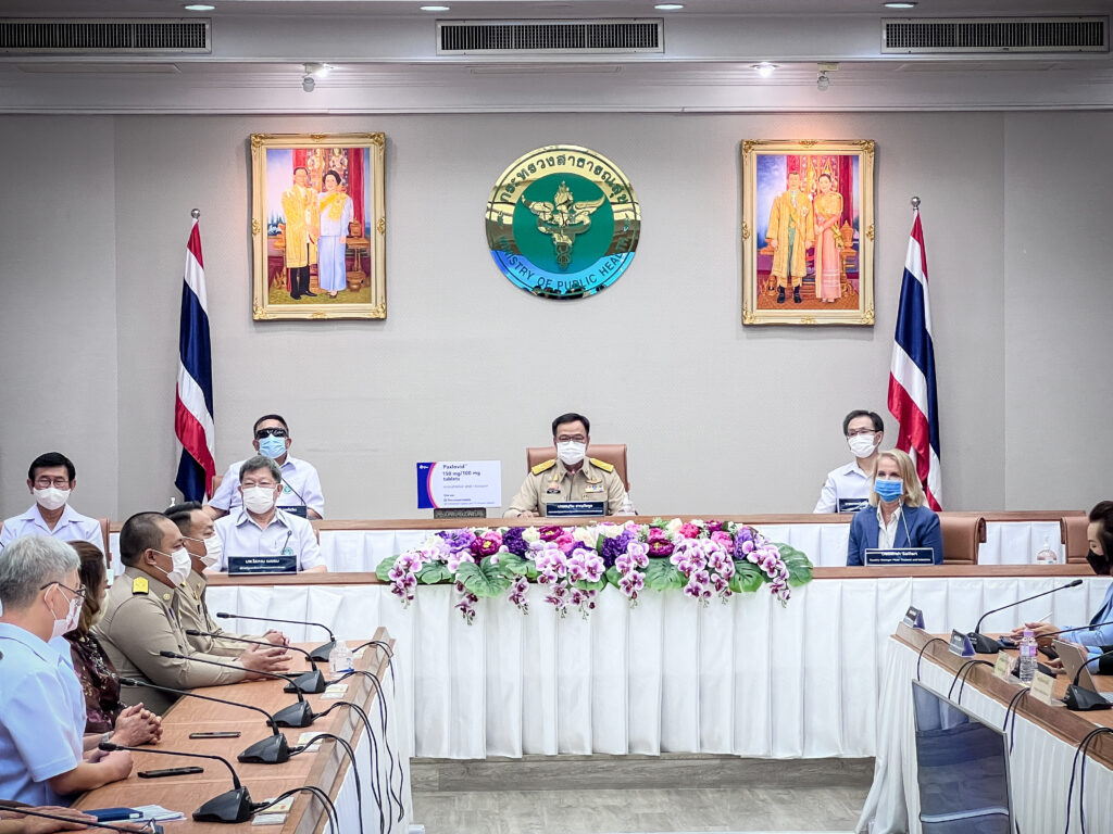 นาจอนุทิน ชาญวีรกูล รองนายกรัฐมนตรีและรัฐมนตรีว่าการกระทรวงสาธารณสุข เป็นประธานพิธีส่งมอบยาแพ็กซ์โลวิด (Paxlovid) ระหว่างกระทรวงสาธารณสุข โดยนพ.สมศักดิ์ อรรฆศิลป์ อธิบดีกรมการแพทย์ และ น.ส.เด็บบราห์ ไซเฟิร์ท กรรมการผู้จัดการใหญ่ บริษัท ไฟเซอร์ (ประเทศไทย) จำกัด ในจำนวนการจัดซื้อ 50,000 คอร์ส รวม 1.5 ล้านเม็ด