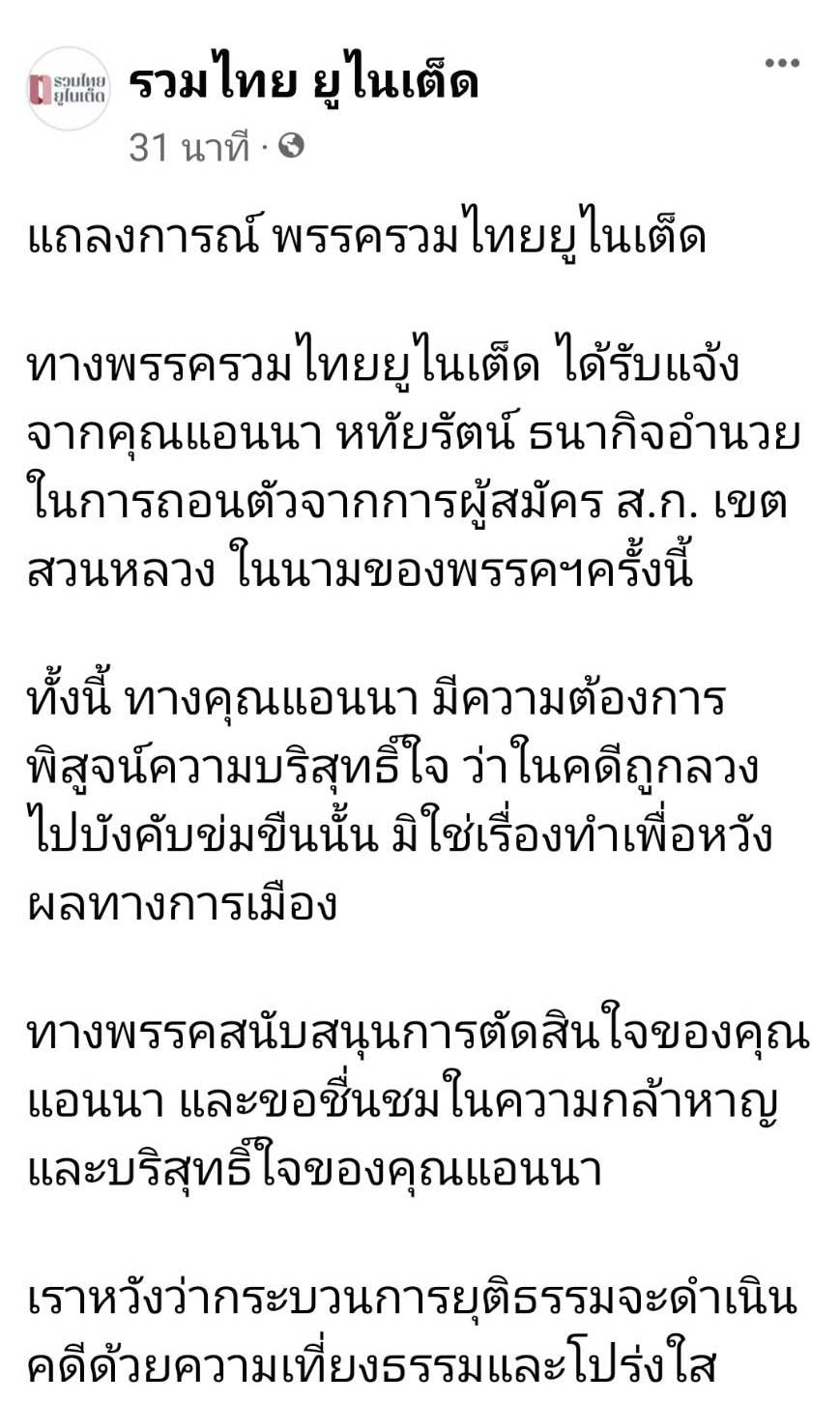 พรรครวมไทยยูไนเต็ด ออกแถลงการณ์ ภายหลังจาก ได้รับแจ้งจากน.ส.หทัยรัตน์ ธนากิจอำนวย (แอนนา) ในการถอนตัวจากผู้สมัครสมาชิกสภากรุงเทพฯ(ส.ก.)เขตสวนหลวง ในนามของพรรค