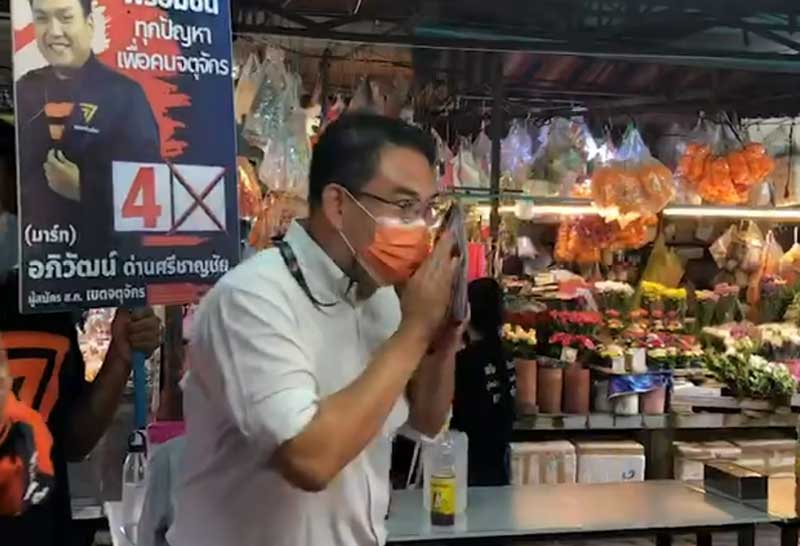 บรรยากาศการลงพื้นที่หาเสียงของ นายวิโรจน์ ลักขณาอดิศร ผู้สมัครผู้ว่าฯ กทม. พรรคก้าวไกล หมายเลข1 และ นายอภิวัฒน์ ด่านศรีชาญชัย ผู้สมัครสมาชิกสภากรุงเทพฯ (ส.ก.) เขตจตุจักร หมายเลข 4 พร้อมด้วยกรุณพล เทียนสุวรรณ อดีตผู้สมัครสมาชิกสภาผู้แทนราษฎร เขตหลักสี่-จตุจักรช่วยหาเสียงที่ตลาดบางเขนเพื่อพบปะพ่อค้าแม่ค้าและประชาชนที่จับจ่ายใช้สอยในตลาด โดยได้รับเสียงตอบรับจากประชาชนเป็นอย่างดี