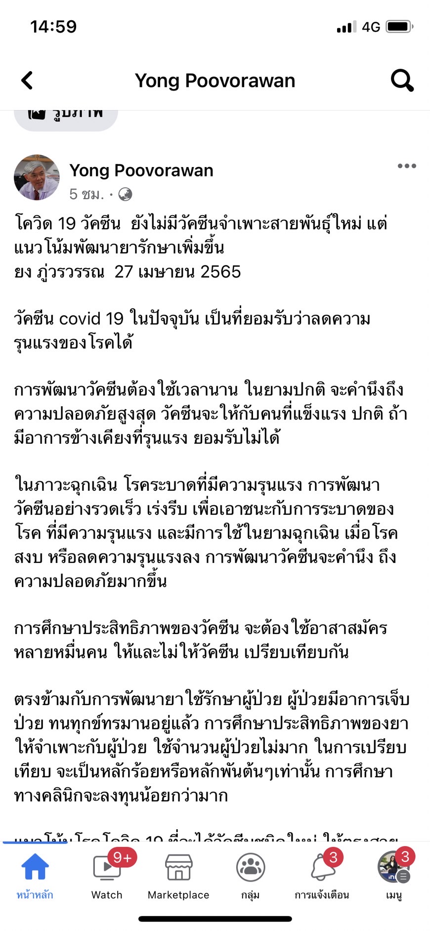 ศ.นพ.ยง ภู่วรวรรณ หัวหน้าศูนย์เชี่ยวชาญเฉพาะทางด้านไวรัสวิทยาคลินิก ภาควิชากุมารเวชศาสตร์ คณะแพทยศาสตร์ จุฬาลงกรณ์มหาวิทยาลัย โพสต์เฟซบุ๊กเรื่อง โควิด 19 วัคซีน ยังไม่มีวัคซีนจำเพาะสายพันธุ์ใหม่ แต่แนวโน้มพัฒนายารักษาเพิ่มขึ้น (ยง ภู่วรวรรณ 27 เมษายน 2565) ว่า วัคซีน covid 19 ในปัจจุบัน เป็นที่ยอมรับว่าลดความรุนแรงของโรคได้