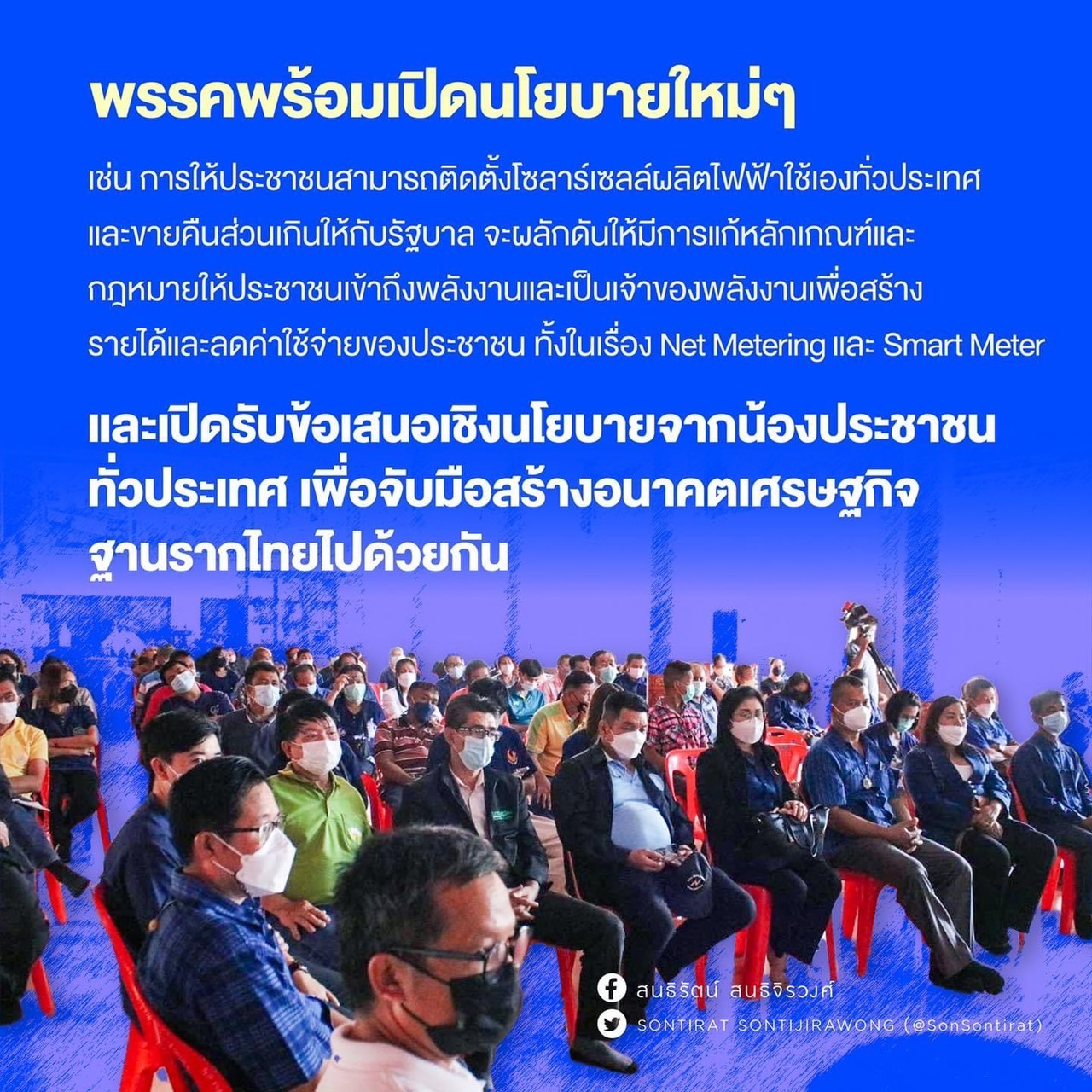 ดังนั้นการเดินหน้ากับนโยบายพลังงานเพื่อทุกคน (Energy for All) ที่ทำได้จริง และเห็นผลจริง จะถูกสานต่อในแนวนโยบายของพรรคสร้างอนาคตไทย เพื่อสร้างอนาคตเศรษฐกิจฐานรากไทยไปด้วยกัน ซึ่งพรรคพร้อมเปิดนโยบายใหม่ๆ เช่น การให้ประชาชนสามารถติดตั้งโซล่าเซลล์ ผลิตไฟฟ้าใช้เอง ทั่วประเทศ และขายคืนส่วนเกินให้กับรัฐบาลจะผลักดันให้มีการแก้หลักเกณฑ์และกฎหมายให้ประชาชนเข้าถึงพลังงาน และเป็นเจ้าของพลังงานเพื่อสร้างรายได้และลดค่าใช้จ่ายของประชาชน ทั้งในเรื่อง Net Metering และ Smart Meter และพร้อมเปิดรับข้อเสนอเชิงนโยบายจากประชาชนทั่วประเทศ
