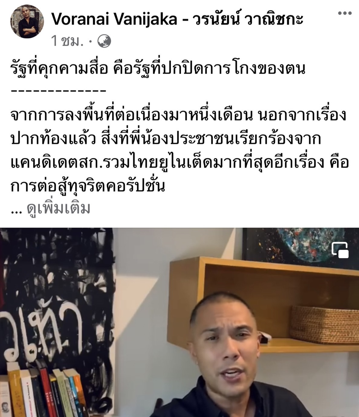 นายวรนัยน์ วาณิชกะ หัวหน้าพรรครวมไทยยูไนเต็ด โพสต์เฟสบุ๊คส่วนตัวผ่านเพจ “Voranai Vanijaka-วรนัยน์ วาณิชกะ” เรื่อง “รัฐที่คุกคามสื่อ คือ รัฐที่ปกปิดการโกงของตน” ว่าจากการลงพื้นที่ต่อเนื่องมาหนึ่งเดือน นอกจากเรื่องปากท้องแล้ว สี่งที่พี่น้องประชาชนเรียกร้องจากแคนดิเดต ส.ก.รวมไทยยูไนเต็ดมากที่สุดอีกเรื่อง คือการต่อสู้ทุจริตคอรัปชั่น