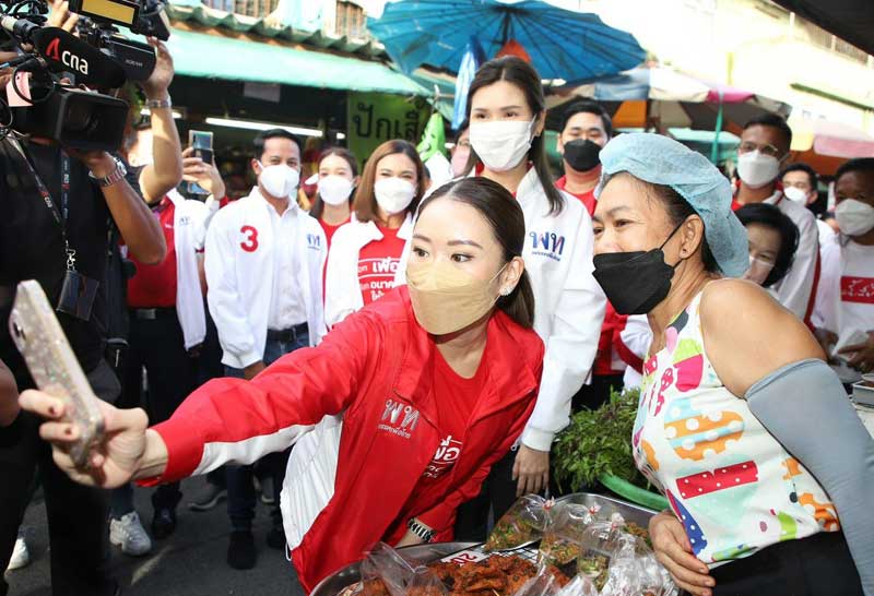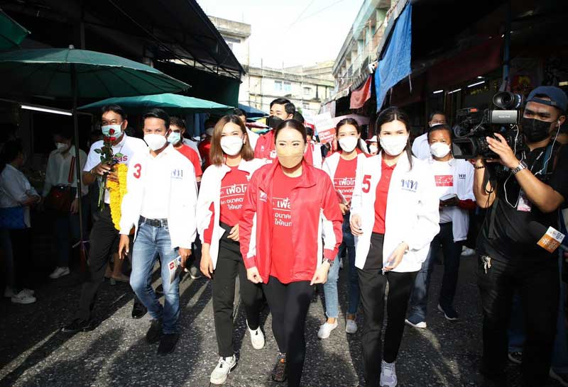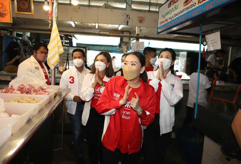 บรรยากาศการลงพื้นที่ช่วยหาเสียงสมาชิกสภากรุงเทพฯ (ส.ก.) ของพรรคเพื่อไทย นำโดยนางสาวแพทองธาร ชินวัตร ประธานคณะที่ปรึกษาด้านการมีส่วนร่วม และนวัตกรรมพรรคเพื่อไทยและหัวหน้าครอบครัวเพื่อไทย พร้อมสามี นายปิฎก สุขสวัสดิ์ และทีมดู ส.ก.ของพรรคเพื่อไทย ช่วยหาเสียงนางชญาดา วิภัติภูมิประเทศ ผู้สมัคร ส.ก.เขตคันนายาว หมายเลข 5 โดยจุดแรกได้เดินทางไปที่ตลาดสายเนตร รามอินทรา กม.8 เพื่อพบปะอ้อนขอคะแนนเสียงจากพ่อค้าแม่ค้าในตลาด