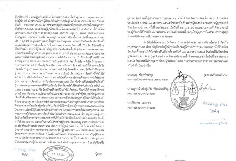 ศาลปกครองกลาง มีคำสั่งเกี่ยวกับวิธีการชั่วคราวก่อนมีคำพิพากษา โดยสั่งให้สำนักงานคณะกรรมการการเลือกตั้ง (กกต.) และผู้อำนวยการ การเลือกตั้งประจำท้องถิ่น กรุงเทพมหานคร รับนายไกรเดช บุนนาค เป็นผู้สมัครรับเลือกตั้งผู้ว่าราชการกรุงเทพมหานคร (ผู้ว่าฯ กทม.) หมายเลข 19