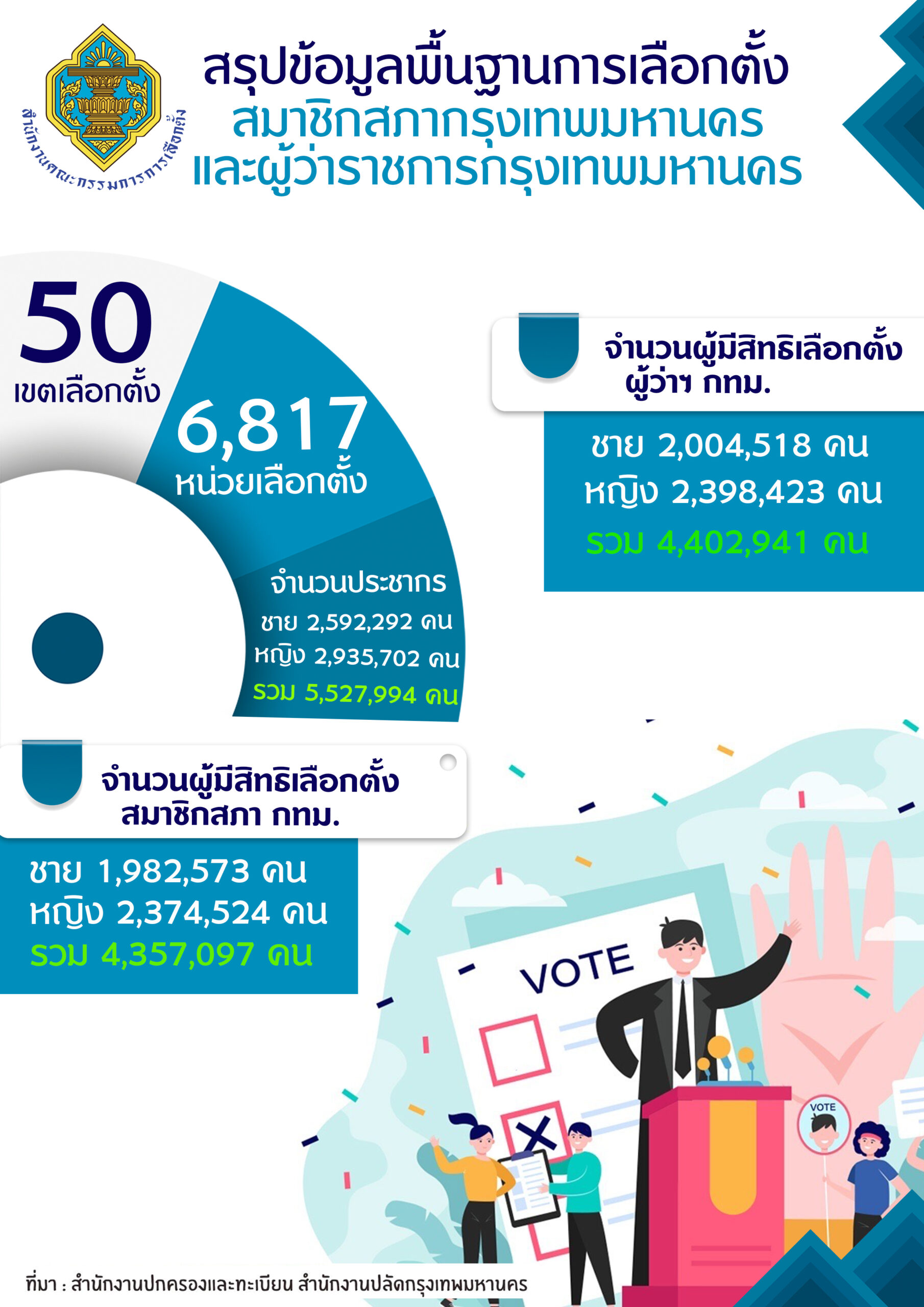 สำหรับการเลือกตั้งสมาชิกสภากรุงเทพมหานคร และผู้ว่าราชการกรุงเทพมหานคร มี 50 เขต 6,817 หน่วย มีประชากร 5,527,994 คน เป็นผู้มีสิทธิ์เลือกตั้งผู้ว่าฯ กทม. 4,402,941 คน