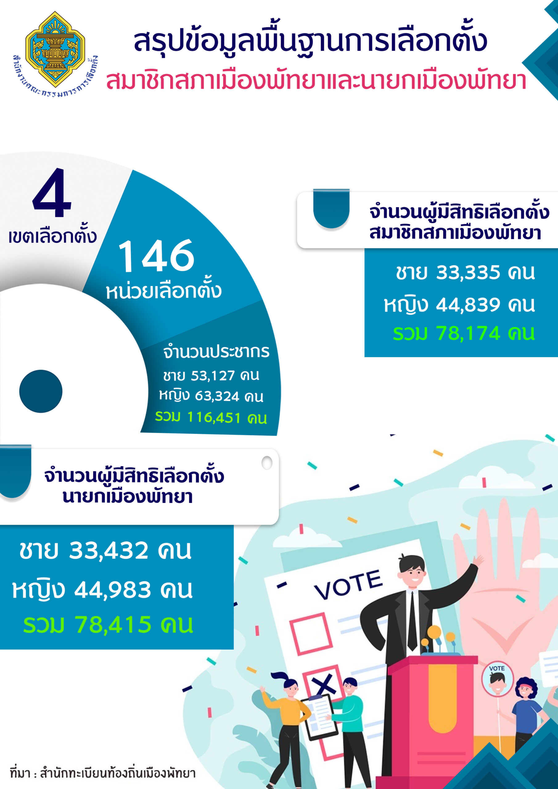 ส่วนการเลือกตั้งสมาชิกสภาเมืองพัทยาและนายกเมืองพัทยา มี 4 เขต 146 หน่วย มีประชากร 116,451 คน เป็นผู้มีสิทธิ์เลือกตั้งนายกเมืองพัทยา 78,415 คน สมาชิกเมืองพัทยา 78,174 คน