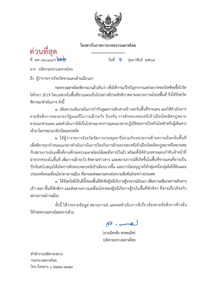 มท.สั่งการผู้ว่าฯจังหวัดชายแดนเพิ่มความเข้มงวด
