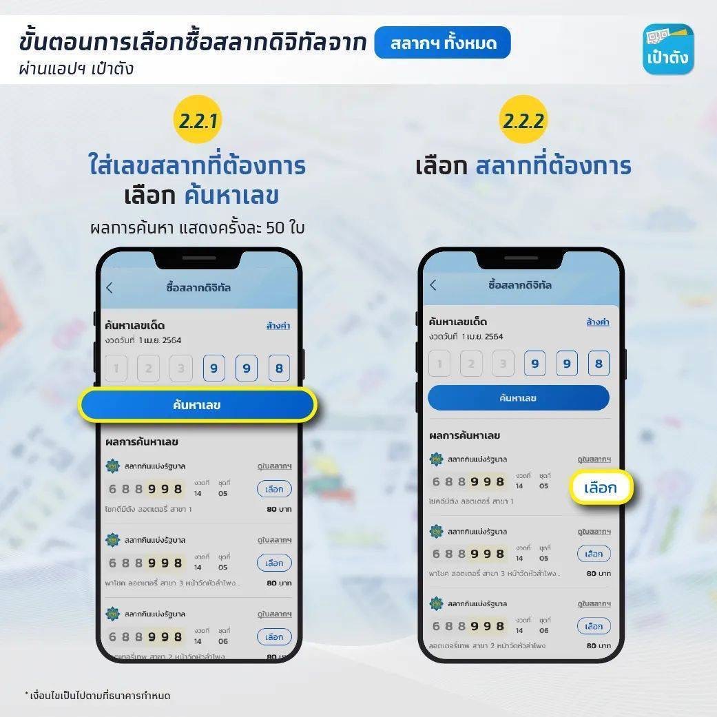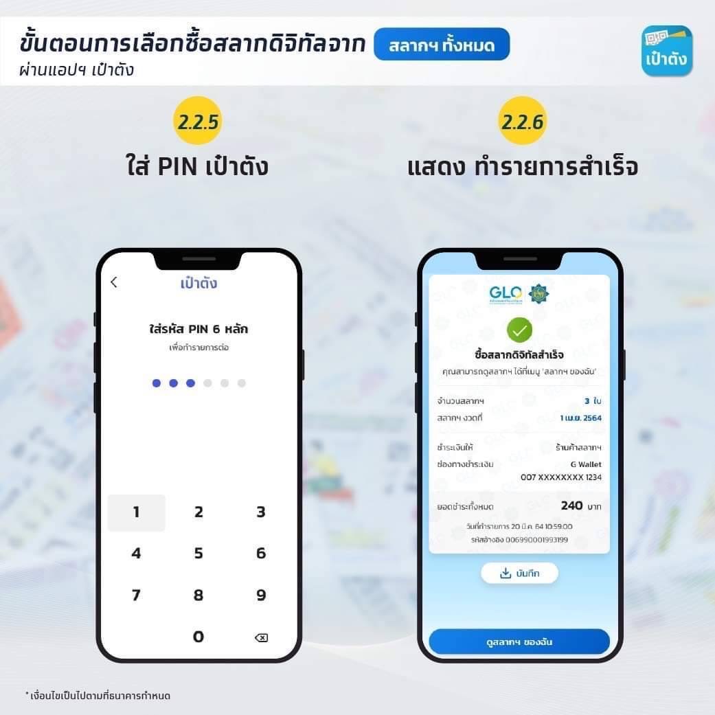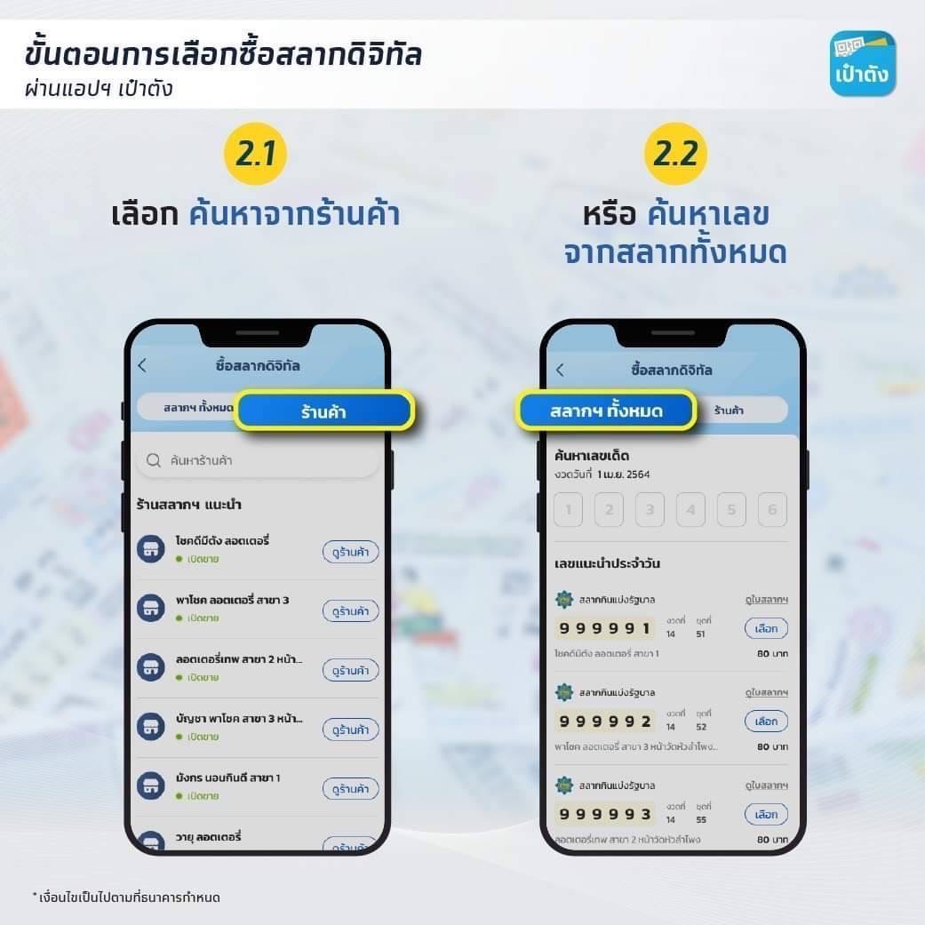 น.ส.ทิพานัน กล่าวว่า วิธีการสั่งซื้อง่ายๆ เพียงเป็นผู้มีอายุ 20 ปีบริบูรณ์ สามารถดาวน์โหลดติดตั้งแอปพลิเคชั่น “เป๋าตัง” และลงทะเบียนเพื่อเข้าสู่ระบบ กดปุ่มสแกน QR Code เลือกเมนู บริการ แล้วไปที่ปุ่ม “สลากกินแบ่งรัฐบาล” กดเข้าไปเลือกที่ “ซื้อสลาก 80 บาท” เมื่อได้สลากที่ต้องการแล้ว ให้สแกน QR Code จากร้านค้าเพื่อชำระเงินและกดยืนยันการชำระเงินด้วยรหัส 6 หลัก สลากที่ซื้อไว้จะขึ้นแสดงผลในระบบ จากนั้นระบบจะบันทึกสลิปหลักฐานการชำระเงินเก็บไว้ให้ในเครื่องโทรศัพท์
