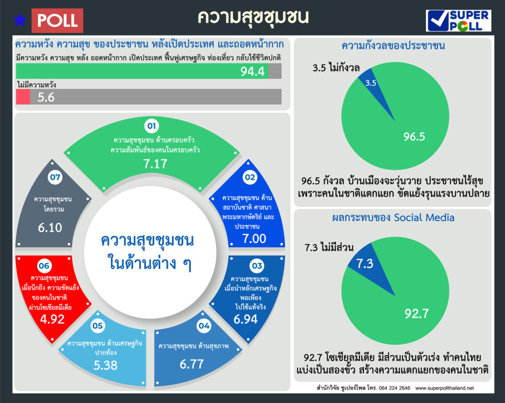 สำนักวิจัยซูเปอร์โพล (SUPER POLL) เปิดเผยผลสำรวจ เรื่อง ความสุขชุมชน กรณีศึกษาประชาชนทุกสาขาอาชีพทั่วประเทศโดยดำเนินโครงการทั้งการวิจัยเชิงปริมาณ (Quantitative Research) และการวิจัยเชิงคุณภาพ (Qualitative Research) จำนวน 1,195 ตัวอย่าง