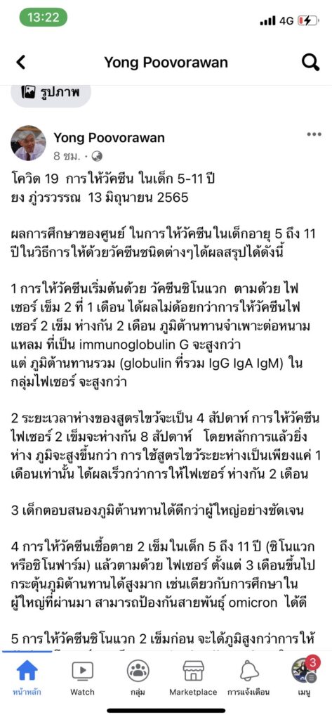 4.การให้วัคซีนเชื้อตาย 2 เข็มในเด็ก 5 ถึง 11 ปี (ชิโนแวก หรือชิโนฟาร์ม) แล้วตามด้วย ไฟเซอร์ ตั้งแต่ 3 เดือนขึ้นไป กระตุ้นภูมิต้านทานได้สูงมาก เช่นเดียวกับการศึกษาในผู้ใหญ่ที่ผ่านมา สามารถป้องกันสายพันธุ์ omicron ได้ดี