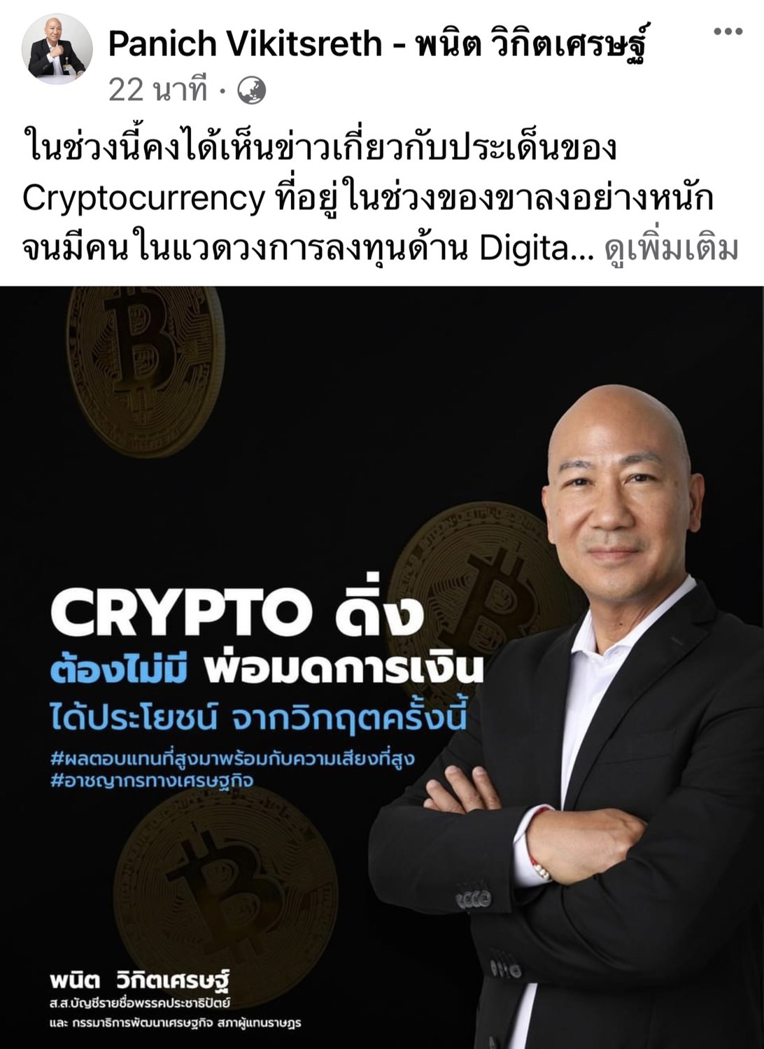 นายพนิต วิกิตเศรษฐ์ ส.ส.บัญชีรายชื่อ พรรคประชาธิปัตย์ และกมธ.พัฒนาเศรษฐกิจ สภาฯ โพสต์ข้อความผ่านเฟสบุ๊ค Panich Vikitsreth – พนิต วิกิตเศรษฐ์ ระบุว่าในช่วงนี้คงได้เห็นข่าวเกี่ยวกับประเด็นของ Cryptocurrency ที่อยู่ในช่วงของขาลงอย่างหนัก จนมีคนในแวดวงการลงทุนด้าน Digital ออกมาเตือนกัน การดิ่งลงของ Cryptocurrency มีผลกระทบกับ Bitcoin อย่างมาก สาเหตุหลักที่ทำให้เกิดมาจากหลายส่วนด้วยกัน ทั้งประเด็นภาวะเงินเฟ้อ การปรับขึ้นของดอกเบี้ย และการเก็งกำไรที่มากเกินปัจจัยพื้นฐานของ Cryptocurrency นี้ ทำให้ในตลาดและผู้ลงทุนอยู่ในภาวะความเสี่ยงในการลงทุนช่วงนี้ ที่เกิดจากการลดลงของเงิน Digital หรือ Bitcoin ที่ลดลงไปกว่า 50 %
