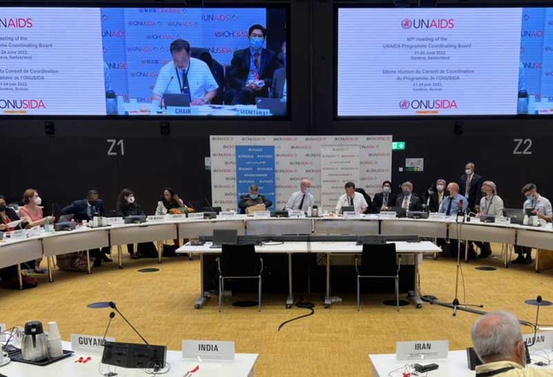 ที่นครเจนีวา สมาพันธรัฐสวิส ณ สำนักงานใหญ่องค์การอนามัยโลก (WHO) 24 มิถุนายน 2565 นายอนุทิน ชาญวีรกูล รองนายกรัฐมนตรี และรัฐมนตรีมนตรีว่าการกระทรวงสาธารณสุข พร้อมคณะ ได้เข้าร่วมประชุมคณะกรรมการบริหารโครงการโรคเอดส์แห่งสหประชาชาติ (UNAIDS Programme Coordinating Board: PCB) ปี 2565 ซึ่งประเทศไทยเป็นประธาน