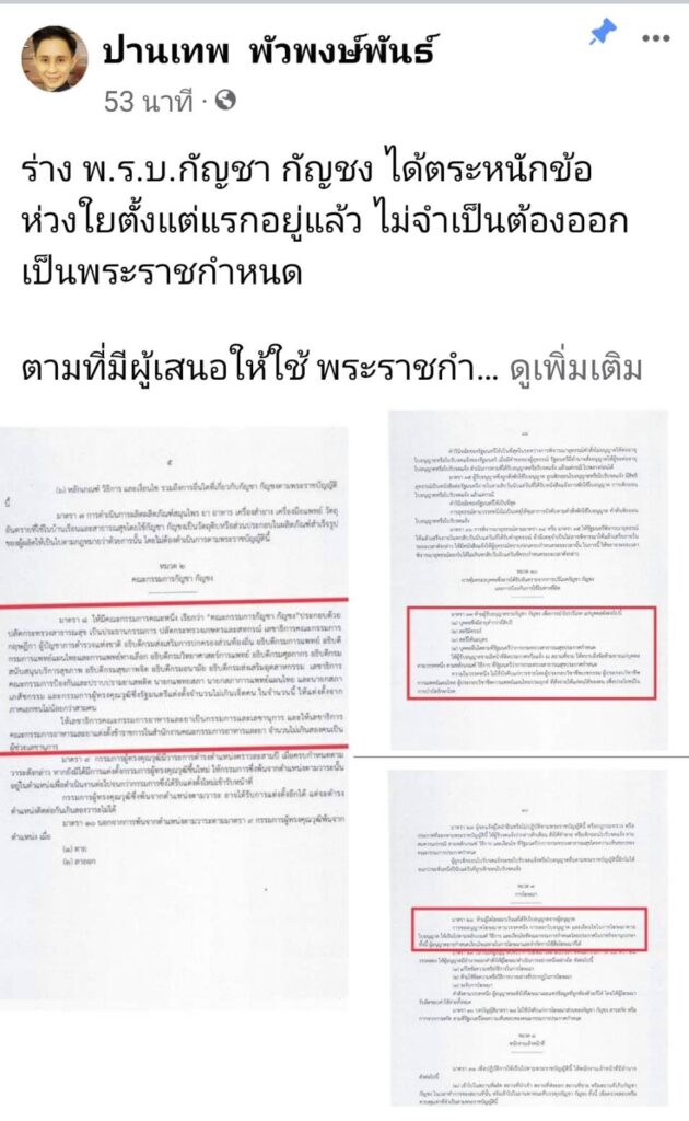 นายปานเทพ พัวพงษ์พันธ์ โฆษก และกรรมาธิการ คณกรรมาธิการวิสามัญ ร่าง พ.ร.บ. กัญชา กัญชง พ.ศ…. สภาผู้แทนราษฎร โพสต์เฟซบุ๊กส่วนตัว แสดงความไม่เห็นด้วยกับข้อเสนอให้รัฐบาลออกพระราชกำหนด เกี่ยวกับกัญชา กัญชง มาใช้ในช่วงสุญญากาศ ขณะที่ยังไม่มีกฎหมายควบคุม มีข้อความดังนี้
