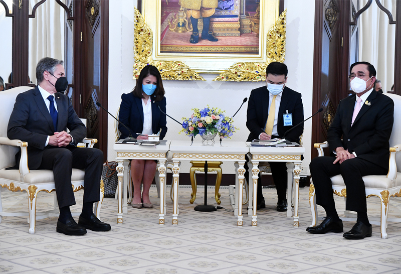 นายแอนโทนี บลิงเกน (H.E. Mr. Antony J. Blinken) รัฐมนตรีว่าการกระทรวงการต่างประเทศสหรัฐอเมริกา เข้าเยี่ยมคารวะ พล.อ. ประยุทธ์ จันทร์โอชา นายกรัฐมนตรีและรัฐมนตรีว่าการกระทรวงกลาโหม ในโอกาสเดินทางเยือนประเทศไทยอย่างเป็นทางการ