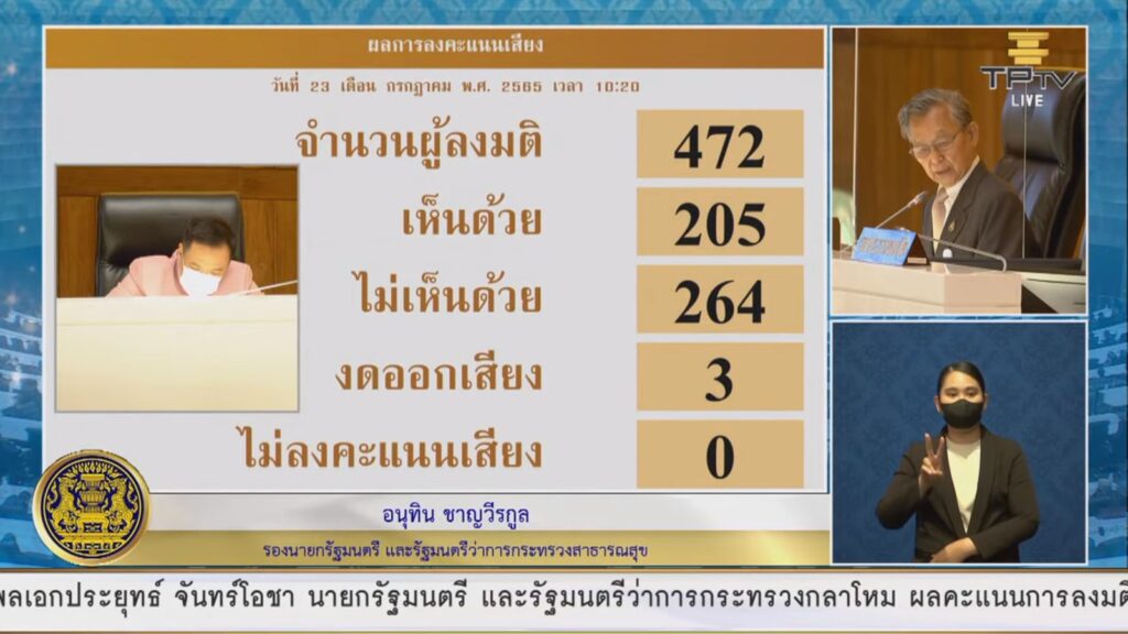 3.นายอนุทิน ชาญวีรกูล รองนายกรัฐมนตรี และรัฐมนตรีว่าการกระทรวงสาธารณสุข ไม่ไว้วางใจ 205 คะแนน ไว้วางใจ 264 คะแนน งดออกเสียง 3 คะแนน