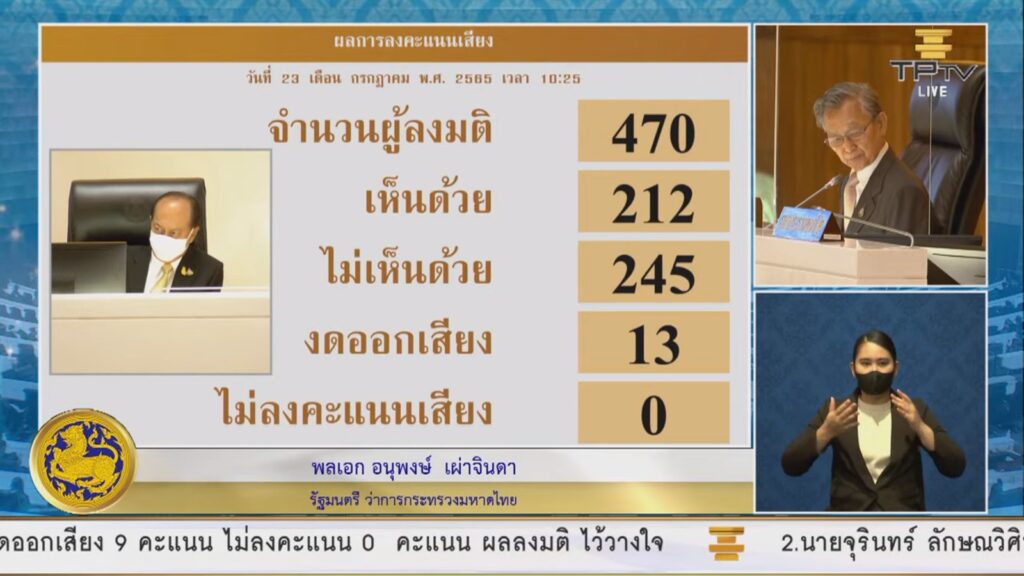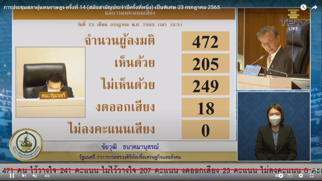 7. นายชัยวุฒิ ธนาคมานุสรณ์ รัฐมนตรีว่าการกระทรวงดิจิทัลเพื่อเศรษฐกิจและสังคม ไม่ไว้วางใจ 205 คะแนน ไว้วางใจ249 คะแนน งดออกเสียง 18 คะแนน
