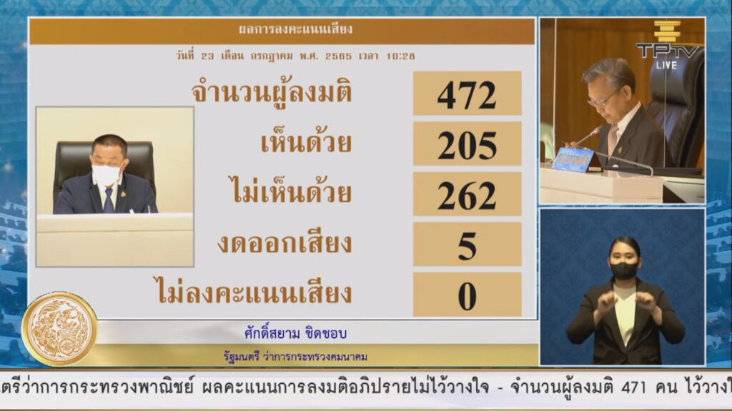 6. นายศักดิ์สยาม ชิดชอบ รัฐมนตรีว่าการกระทรวงคมนาคม ไม่ไว้วางใจ. 205คะแนน ไว้วางใจ 262 คะแนน งดออกเสียง 5 คะแนน