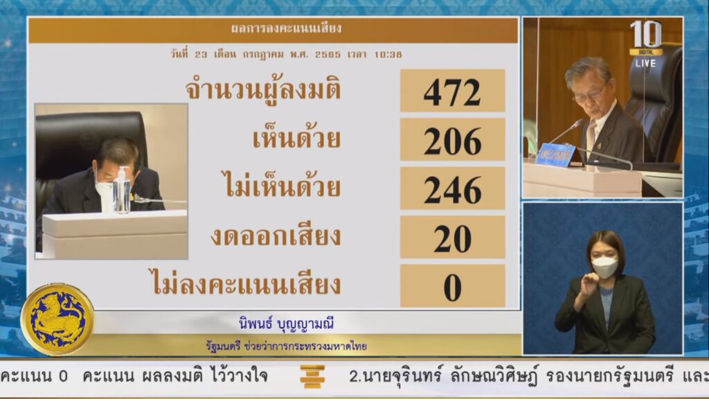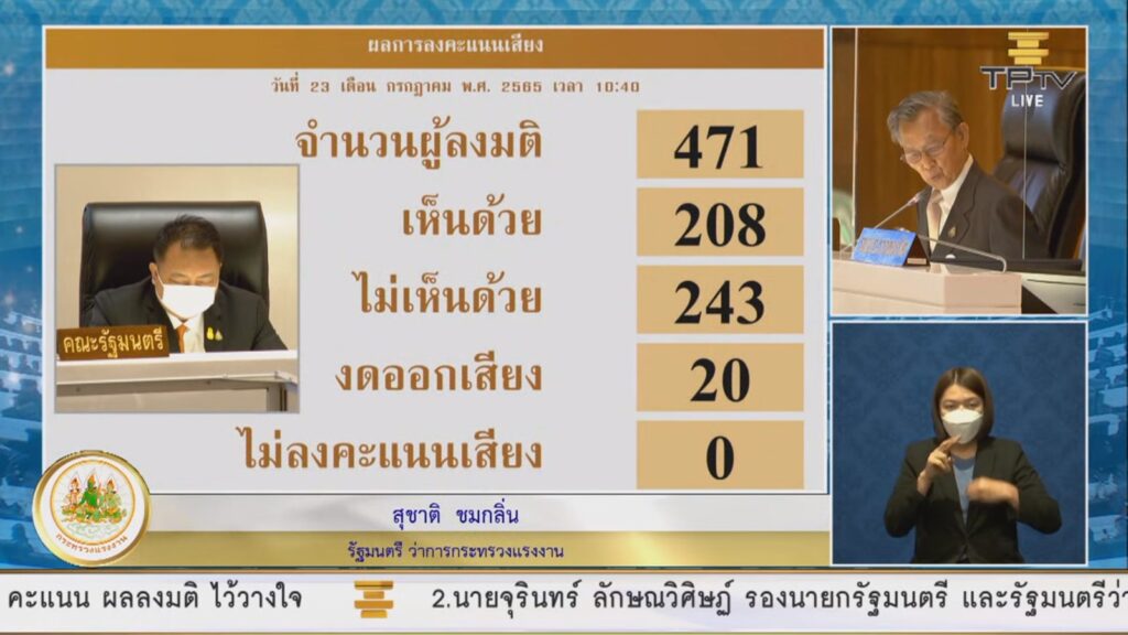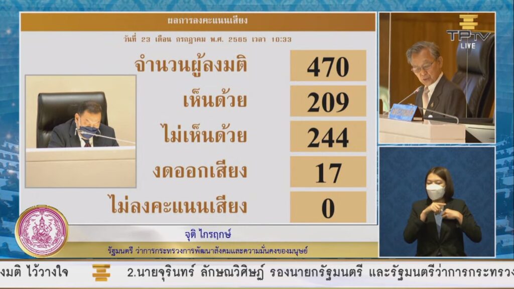 8. นายจุติ ไกรฤกษ์ รัฐมนตรีว่าการกระทรวงการพัฒนาสังคมและความมั่นคงของมนุษย์ ไม่ไว้วางใจ 209 คะแนน ไว้วางใจ244 คะแนน งดออกเสียง 17 คะแนน