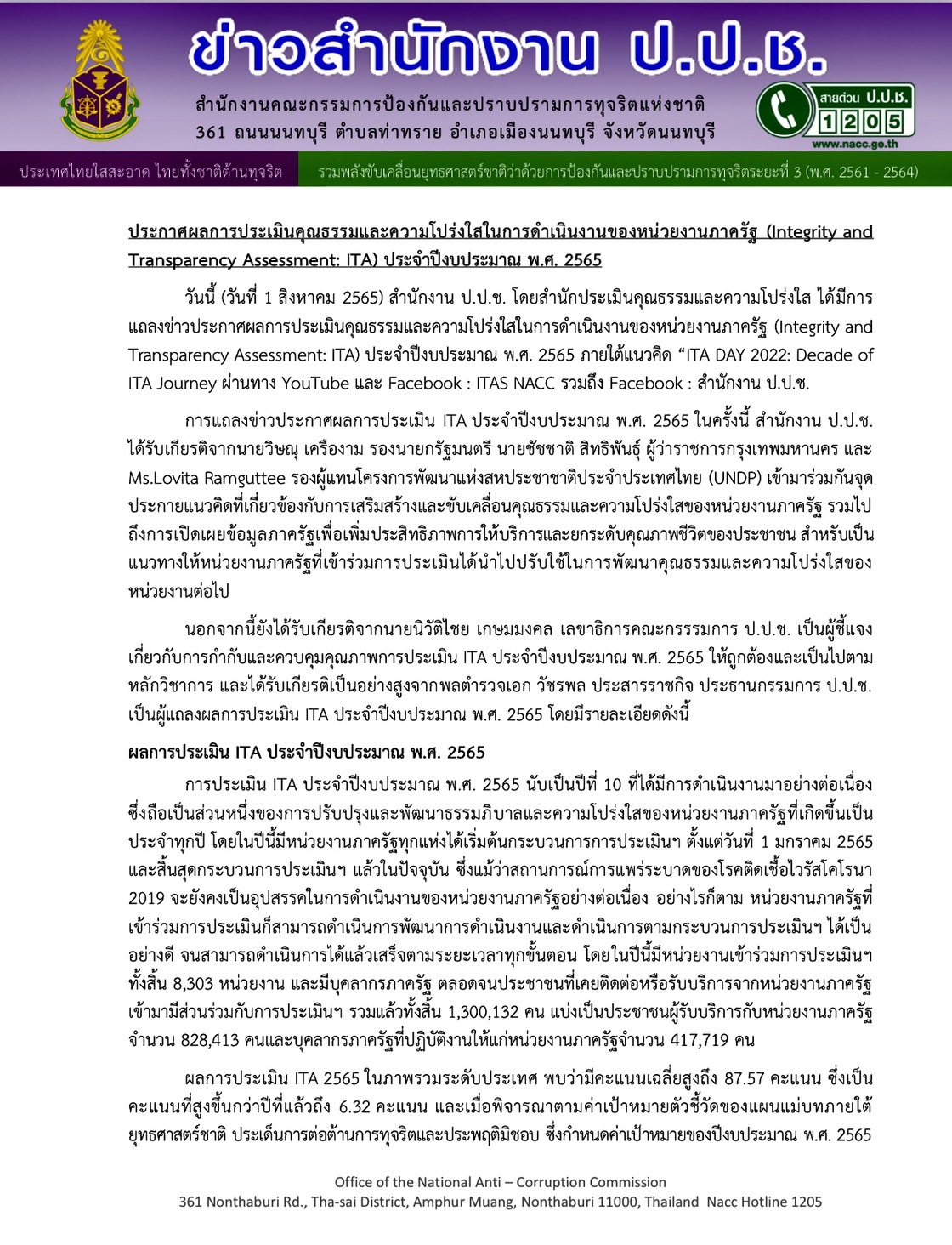 สำนักงานป้องกันและปราบปรามการทุจริตแห่งชาติ (ป.ป.ช.) โดยสำนักประเมินคุณธรรมและความโปร่งใส ได้มีการแถลงข่าวประกาศผลการประเมินคุณธรรมและความโปร่งใสในการดำเนินงานของหน่วยงานภาครัฐ (Integrity and Transparency Assessment: ITA) ประจำปีงบประมาณ พ.ศ. 2565 ภายใต้แนวคิด “ITA DAY 2022: Decade of ITA Journey