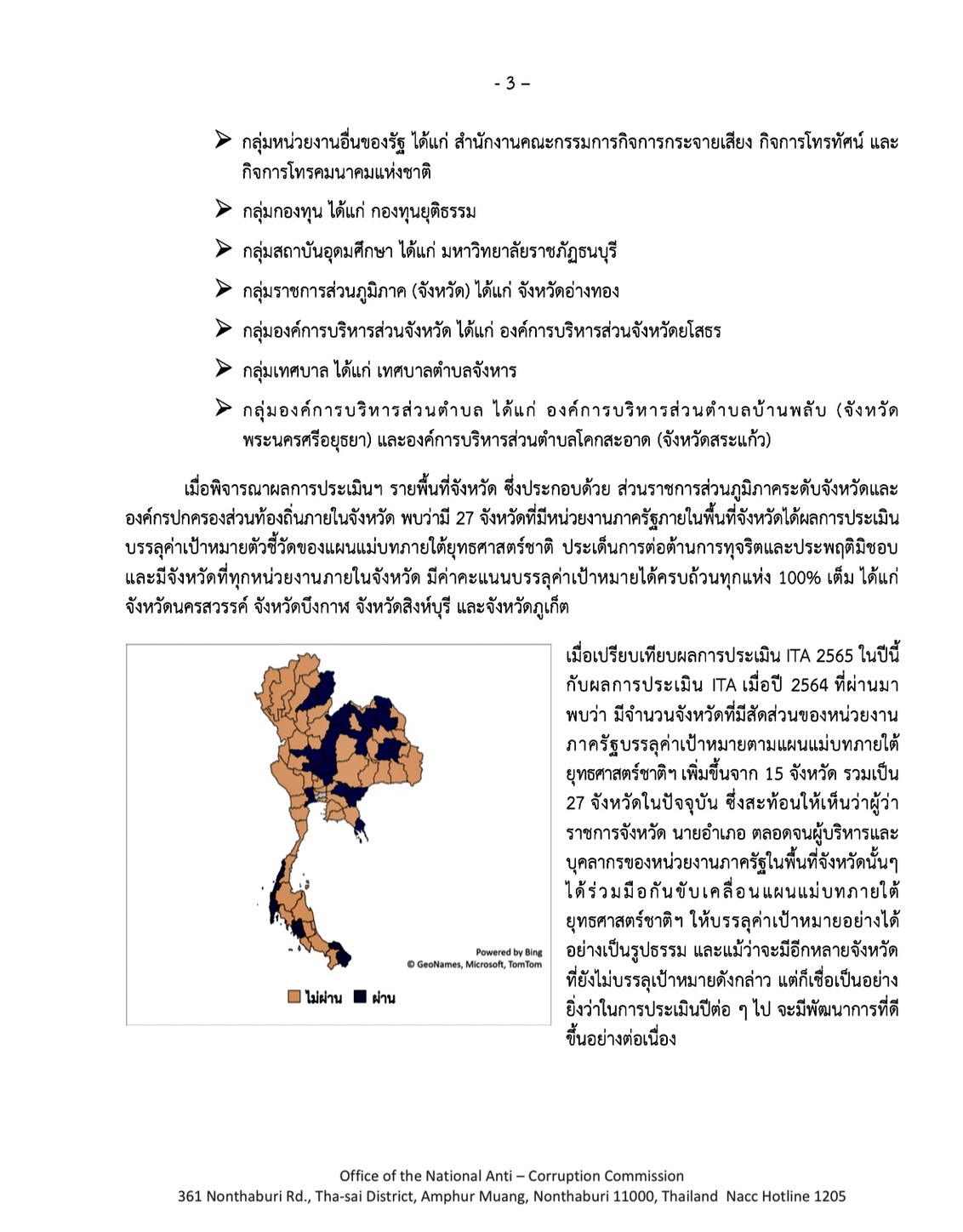 ผลปรากฏว่ามีหน่วยงานที่บรรลุค่าเป้าหมาย 5,855 หน่วยงาน คิดเป็นร้อยละ 70.52 ของหน่วยงานภาครัฐที่เข้าร่วมการประเมินทั้งหมด ซึ่งมีหน่วยงานที่มีคะแนนบรรลุค่าเป้าหมาย “เพิ่มขึ้นจากปีที่แล้วถึง 1,709 หน่วยงาน” เมื่อพิจารณาผลการประเมินฯ รายพื้นที่จังหวัด ซึ่งประกอบด้วย ส่วนราชการส่วนภูมิภาคระดับจังหวัดและองค์กรปกครองส่วนท้องถิ่นภายในจังหวัด พบว่ามี 27 จังหวัดที่มีหน่วยงานภาครัฐภายในพื้นที่จังหวัดได้ผลการประเมินบรรลุค่าเป้าหมายตัวชี้วัดของแผนแม่บทภายใต้ยุทธศาสตร์ชาติ ประเด็นการต่อต้านการทุจริตและประพฤติมิชอบ และมีจังหวัดที่ทุกหน่วยงานภายในจังหวัด มีค่าคะแนนบรรลุค่าเป้าหมายได้ครบถ้วนทุกแห่ง 100% เต็ม ได้แก่ จังหวัดนครสวรรค์ จังหวัดบึงกาฬ จังหวัดสิงห์บุรี และจังหวัดภูเก็ตแม้ว่าจะมีอีกหลายจังหวัดที่ยังไม่บรรลุเป้าหมายดังกล่าว แต่ก็เชื่อเป็นอย่างยิ่งว่าในการประเมินปีต่อ ๆ ไป จะมีพัฒนาการที่ดีขึ้นอย่างต่อเนื่อง