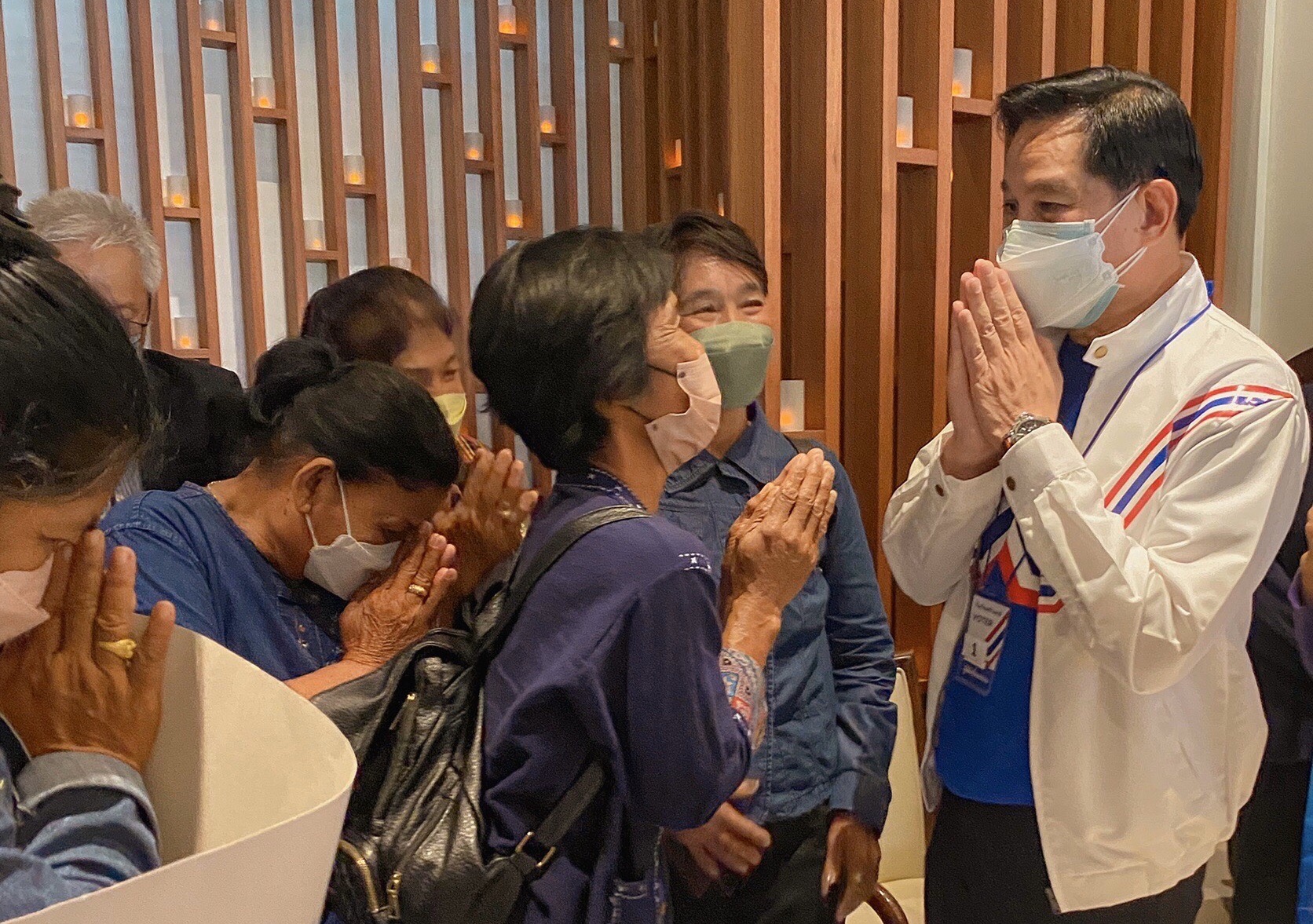 ด้านตัวแทนชาวบ้าน กล่าวว่า ในฐานะตัวแทนชาวชุมชนมาลัยแมน กลุ่มชาวนา อ.มโนรมย์ ชาวประมงแสมสาร จ.ชลบุรี และผู้พิการที่ได้รับความช่วยเหลือ ได้นำช่อดอกไม้ ข้าวสาร และของฝากพื้นถิ่นมามอบให้นายพีระพันธุ์เพื่อร่วมแสดงความยินดีเนื่องจากรับตำแหน่งหัวหน้าพรรคแล้ว