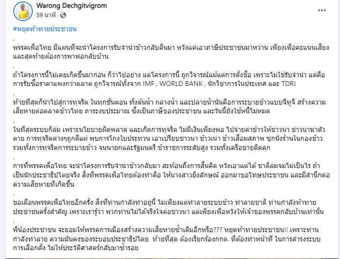 นพ.วรงค์ เดชกิจวิกรม หัวหน้าพรรคไทยภักดี ระบุข้อความผ่านเพจเฟซบุ๊กส่วนตัว “Warong Dechgitvigrom” ว่า #หยุดท้าทายประชาชน พรรคเพื่อไทย มีแผนที่จะนำโครงการรับจำนำข้าวกลับคืนมา หวังแค่เอาภาษีประชาชนมาหว่าน เพียงเพื่อคะแนนเสียง และสุดท้ายต้องการพาพ่อกลับบ้าน