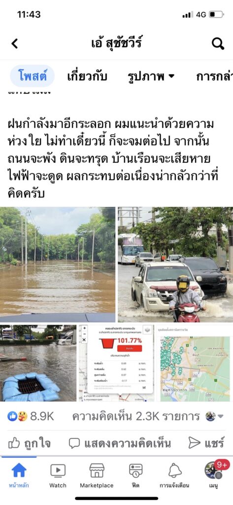 6. เห็นกระสอบทรายมากั้นท่อระบายน้ำ ผิดที่ ผิดเวลา ไม่กล้าวิเคราะห์จริงๆ จะให้น้ำลงไปทางไหน ท่วมถนนจมขนาดนี้ เครื่องสูบก็แทบไม่มี “ฝนกำลังมาอีกระลอก ผมแนะนำด้วยความห่วงใย ไม่ทำเดี๋ยวนี้ก็จะจมต่อไป จากนั้นถนนจะพัง ดินจะทรุด บ้านเรือนจะเสียหาย ไฟฟ้าจะดูด ผลกระทบต่อเนื่องน่ากลัวกว่าที่คิดครับ” สุชัชวีร์ระบุ