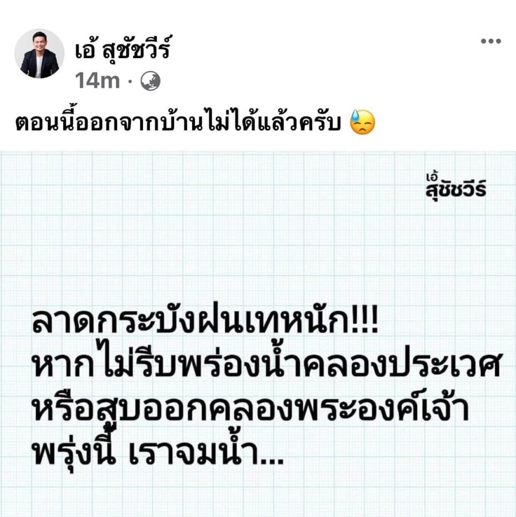 นายสุชัชวีร์ สุวรรณสวัสดิ์ อดีตผู้สมัครผู้ว่าราชการกรุงเทพมหานคร (กทม.) ว่าที่ผู้สมัครสมาชิกผู้แทนราษฎร บัญชีรายชื่อ พรรคประชาธิปัตย์ โพสต์ข้อความผ่านทางเฟซบุ๊ก “เอ้ สุชัชวีร์” (10 กย.) ถึงสถานการณ์น้ำท่วม ในหัวข้อ ‘ไม่มีปั๊ม ไม่มีเซนเซอร์ ไม่เปิดประตูน้ำ ไม่ระบายน้ำ ไม่รอด’