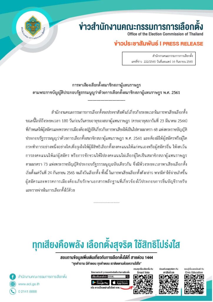 สำนักงานคณะกรรมการการเลือกตั้งประชาสัมพันธ์เกี่ยวกับระยะเวลาในการหาเสียงเลือกตั้ง ขณะใกล้ถึงระยะเวลา 180 วันก่อนวันครบอายุของสภาผู้แทนราษฎร ซึ่งจะครบอายุสภาวันที่ 23 มีนาคม 2566