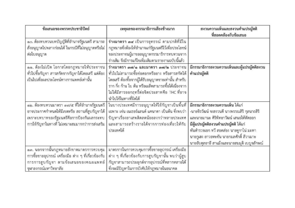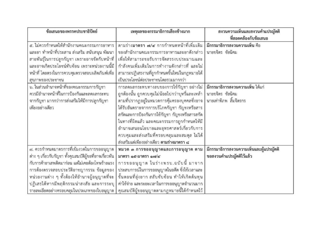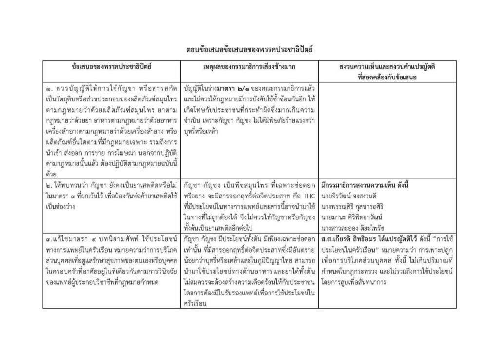 ตามที่คณะกรรมาธิการร่างพระราชบัญญัติกัญชากัญชงได้พิจารณาทบทวนร่างพระราชบัญญัติตามที่สภาผู้แทนราษฎรได้ลงมติตามข้อเสนอของพรรคประชาธิปัตย์และพรรคเพื่อไทย และมีมติว่าไม่จำเป็นต้องแก้ไข