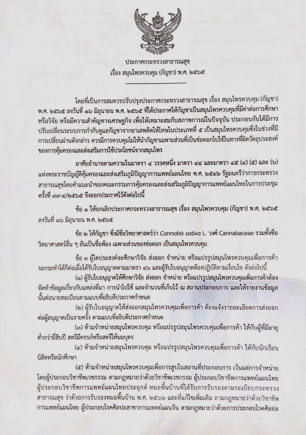 นายอนุทิน ชาญวีรกูล รองนายกรัฐมนตรีและ รัฐมนตรีว่าการกระทรวงสาธารณสุข ได้ลงนามในประกาศกระทรวงสาธารณสุข เรื่อง สมุนไพรควบคุม (กัญชา) พ.ศ. 2565 เนื้อหาระบุว่า