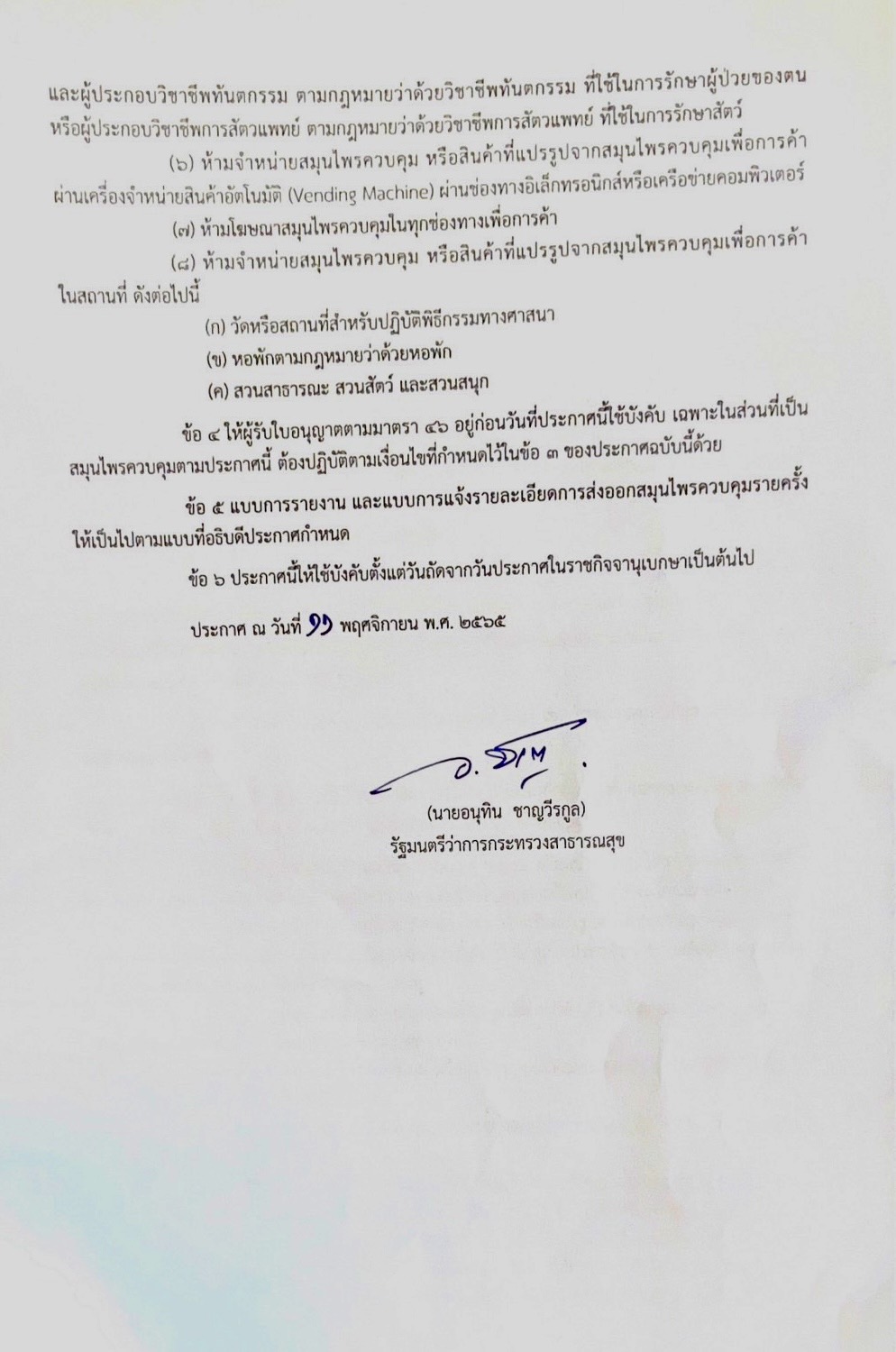 “อนุทิน” ลงนามประกาศ สธ. ให้ “ช่อดอกกัญชา” เป็นสมุนไพรควบคุม ห้ามจำหน่ายให้เด็ก สตรีมีครรภ์ นักเรียน นักศึกษา ห้ามโฆษณาเพื่อการค้า ห้ามจำหน่ายเพื่อการสูบในสถานประกอบการ ห้ามจำหน่ายผ่านตู้อัตโนมัติ