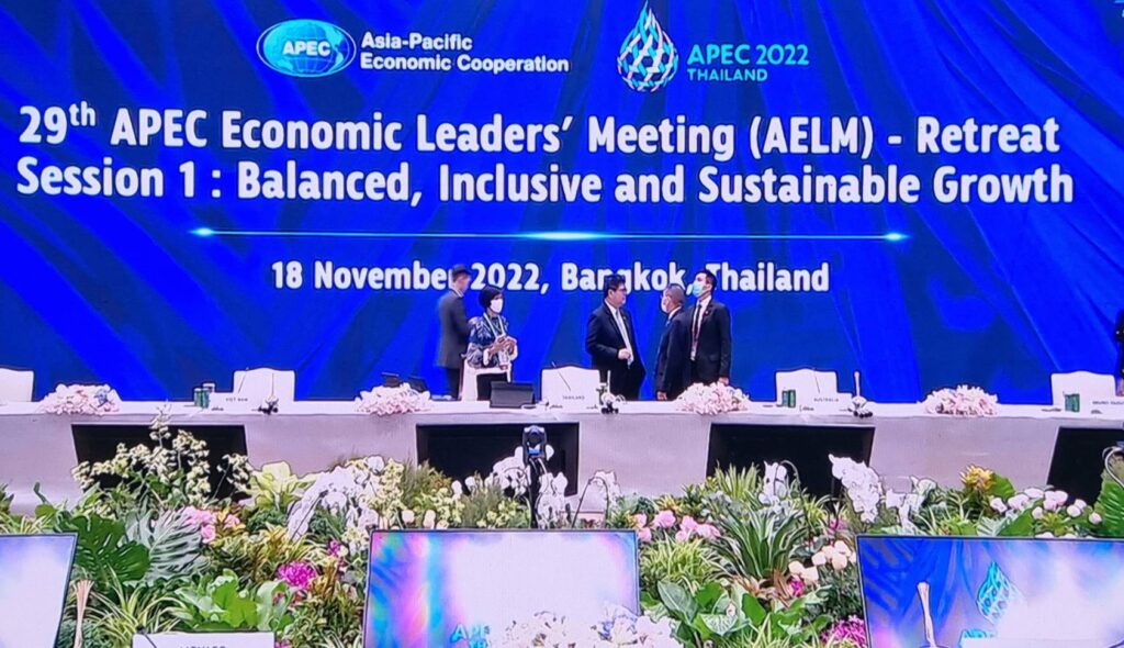 พล.อ.ประยุทธ์ จันทร์โอชา นายกรัฐมนตรี ให้การต้อนรับผู้นำและผู้แทนทั้ง 21 เขตเศรษฐกิจ ในการประชุมผู้นำเขตเศรษฐกิจเอเปค ครั้งที่ 29 อย่างเป็นทางการ ก่อนจะเป็นประธานการประชุมเขตผู้นำเขตเศรษฐกิจเอเปค ครั้งที่ 29 (Retreat ช่วงที่ 1) ภายใต้หัวข้อ “การเจริญเติบโตที่สมดุล ครอบคลุมและยั่งยืน (Balanced, Inclusive and Sustainable Growth)”