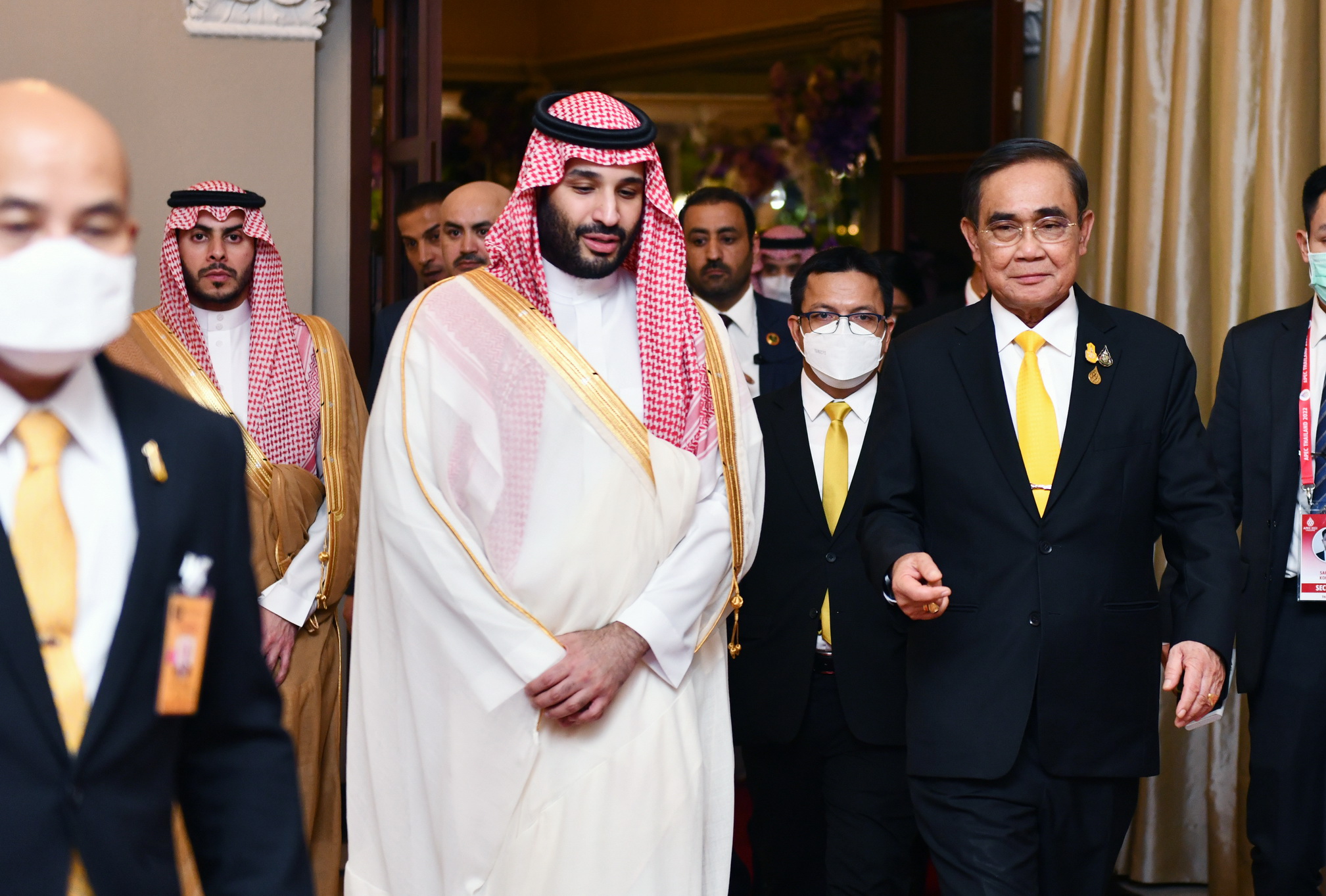 พล.อ.ประยุทธ์ จันทร์โอชา นายกรัฐมนตรีและรัฐมนตรีว่าการกระทรวงกลาโหม เข้าเฝ้าฯ หารือทวิภาคีกับเจ้าชายมุฮัมมัด บิน ซัลมาน บิน อับดุลอะซีซ อาล ซะอูด (His Royal Highness Prince Mohammed bin Salman bin Abdulaziz Al Saud) มกุฎราชกุมาร และนายกรัฐมนตรีแห่งราชอาณาจักรซาอุดีอาระเบีย ในโอกาสเยือนไทยอย่างเป็นทางการ และ ในฐานะแขกพิเศษของการประชุมผู้นำเขตเศรษฐกิจเอเปค ปี 2565 โดยนายกรัฐมนตรี ซาบซึ้งสำหรับการตอบรับการเสด็จพระราชดำเนินเยือนไทยอย่างเป็นทางการ และการตอบรับเข้าร่วมการประชุมเอเปค ในฐานะแขกพิเศษของไทย พร้อมกล่าวถวายพระพรชัยมงคลแด่สมเด็จพระราชาธิบดีแห่งราชอาณาจักรซาอุดีอาระเบีย และแสดงความยินดีที่มกุฎราชกุมารแห่งราชอาณาจักรซาอุดีอาระเบียทรงได้รับการแต่งตั้งให้เป็นนายกรัฐมนตรี