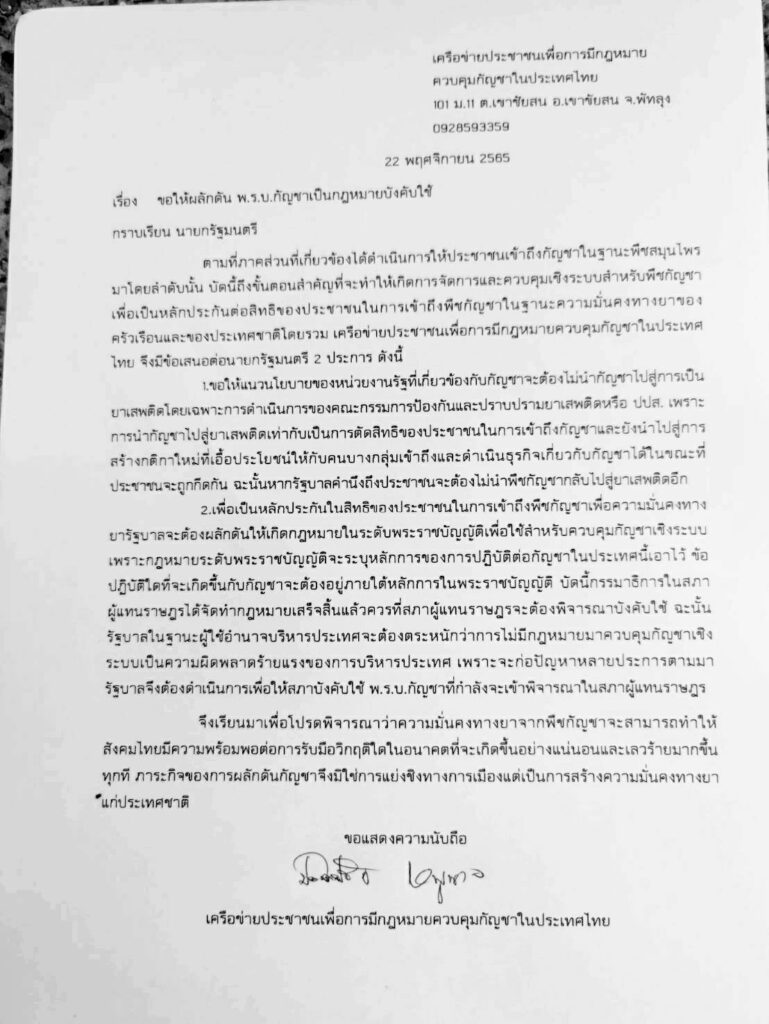 จึงมีข้อเสนอต่อนายกรัฐมนตรี 2 ประการ คือ ขอให้แนวนโยบายของหน่วยงานรัฐที่เกี่ยวข้องกับกัญชา จะต้องไม่นำกัญชาไปสู่การเป็นยาเสพติด โดยเฉพาะการดำเนินการของคณะกรรมการป้องกันและปราบปรามยาเสพติด หรือป.ป.ส. เพราะการนำกัญชาไปสู่ยาเสพติดเท่ากับเป็นการตัดสิทธิของประชาชนในการเข้าถึงกัญชา และยังนำไปสู่การสร้างกติกาใหม่ที่เอื้อประโยชน์ให้กับคนบางกลุ่มเข้าถึงและดำเนินธุรกิจเกี่ยวกับกัญชาได้ในขณะที่ประชาชนจะถูกกีดกัน