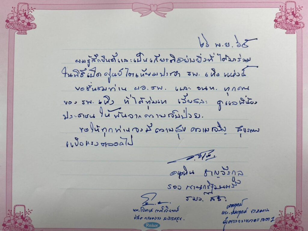 ได้เกิดขึ้นในพื้นที่ ส่วนตัวเคยมาที่นี่เมื่อประมาณปีเศษ นางอทิตาธร วันไชยธนวงศ์ นายก อบจ.เชียงราย และนายรังสรรค์ วันไชยธนวงศ์ ส.ส.เชียงราย ได้พาเดินเยี่ยมชมโรงพยาบาล พร้อมกับท่านผู้อำนวยการโรงพยาบาล โดยมีการรายงานว่า สิ่งที่เป็นประโยชน์ที่สุด ถ้าทำได้คือ การมีศูนย์ฟอกไต ประจำอยู่ที่โรงพยาบาลแห่งนี้ เพราะเป็นการอำนวยความสะดวกให้กับพี่น้องประชาชน โดยก่อนหน้า ผู้ป่วยโรคไตต้องเดินทางเข้าตัวเมือง เสียเวลา ค่าใช้จ่าย แล้วต้องนำสมาชิกในครอบครัวไปด้วย เสียโอกาส เมื่อรับฟังมา ก็หาทางทำให้สำเร็จ วันนี้ เป็นรูปธรรมแล้ว