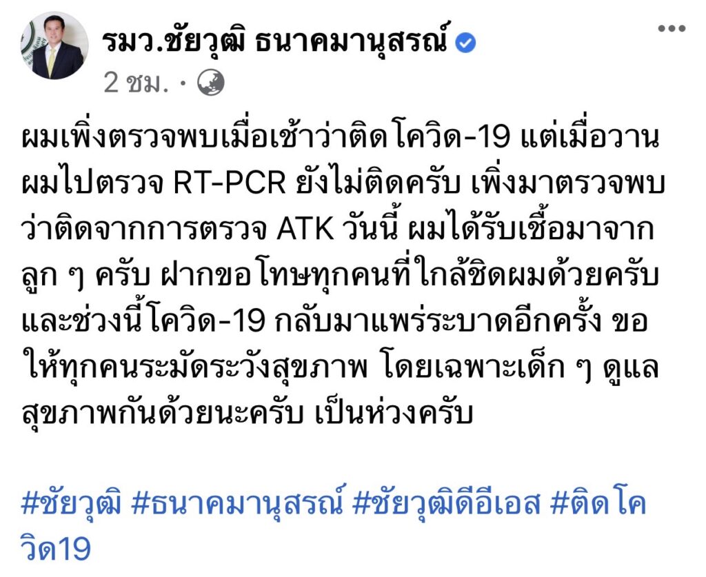 นายชัยวุฒิ ธนาคมานุสรณ์ รมว.ดิจิทัลเพื่อเศรษฐกิจและสังคม (ดีอีเอส) ได้โพสต์เฟซบุ๊กส่วนตัว ระบุว่า “ผมเพิ่งตรวจพบเมื่อเช้าว่าติดโควิด-19 แต่เมื่อวานผมไปตรวจ RT-PCR ยังไม่ติดครับ เพิ่งมาตรวจพบว่าติดจากการตรวจ ATK วันนี้ ผมได้รับเชื้อมาจากลูก ๆ ครับ ฝากขอโทษทุกคนที่ใกล้ชิดผมด้วยครับ และช่วงนี้โควิด-19 กลับมาแพร่ระบาดอีกครั้ง ขอให้ทุกคนระมัดระวังสุขภาพ โดยเฉพาะเด็ก ๆ ดูแลสุขภาพกันด้วยนะครับ เป็นห่วงครับ”