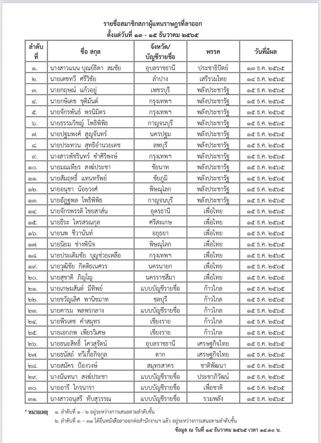24. นายพีรเดช คําสมุทร ส.ส.เชียงราย พรรคก้าวไกล 25.นายเอกภพ เพียรพิเศษ ส.ส.เชียงราย พรรคก้าวไกล 26. นายธนะสิทธิ์ โควสุรัตน์ ส.ส.อุบลราชธานี พรรคเศรษฐกิจไทย 27. นายธนัสถ์ ทวีเกื้อกูลกิจ ส.ส.ตาก พรรคเศรษฐกิจไทย 28. นายสมัคร ป้องวงษ์ ส.ส.สมุทรสาคร พรรคชาติพัฒนา 29. น.ส.นันทนา สงฆ์ประชา ส.ส.บัญชีรายชื่อ พรรคประชาภิวัฒน์ 30. นายอารี ไกรนรา ส.ส.บัญชีรายชื่อ พรรคเพื่อชาติ และ 31. น.ส.อนุสรี ทับสุวรรณ ส.ส.บัญชีรายชื่อ พรรครวมพลัง ซึ่งทั้ง 31 คนที่ลาออกนี้ มีผลตั้งแต่วันที่ 13-15 ธ.ค.2565