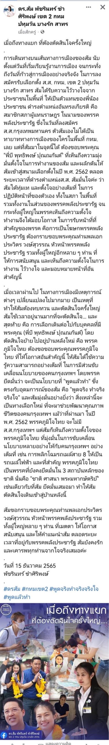 ตนขอกราบขอบพระคุณท่านพล.อ.ประวิตร วงษ์สุวรรณ หัวหน้าพรรคพลังประชารัฐ รวมทั้งผู้ใหญ่หลาย ๆ ท่าน ที่เมตตา ให้โอกาส สนับสนุน และให้คำแนะนำ ตลอดระยะเวลาที่อยู่กับพรรคพลังประชารัฐ ตนยังคงรัก และเคารพทุกท่านจากใจจริงเสมอ พร้อมติดแฮชแท็ก #ดรส้ม #กทมเขต2 #พูดจริงทำจริงจริงใจ #พูดแล้วทำ