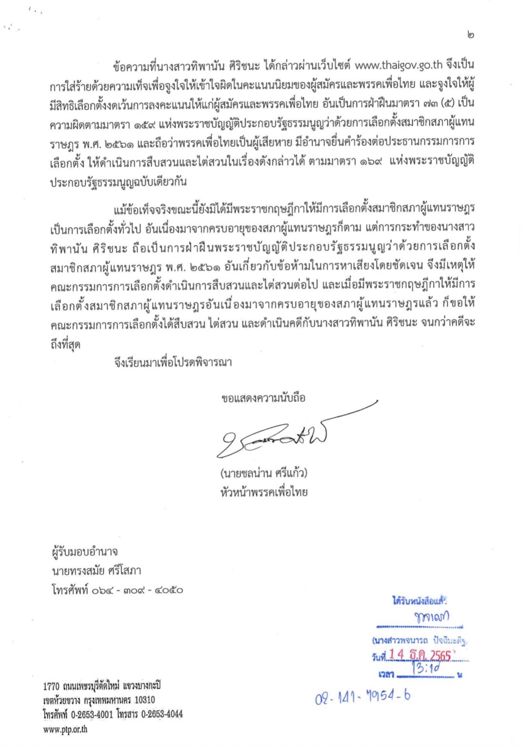 เพื่อไทยแจ้งความเอาผิดอาญา – ร้อง กกต. เหตุ ‘ทิพานัน’ ใส่ร้ายพรรค ออกนโยบายคิดใหญ่ โกงเป็น ชี้เป็นสมาชิกพรรคการเมืองควรทำประโยชน์ให้ประชาชน