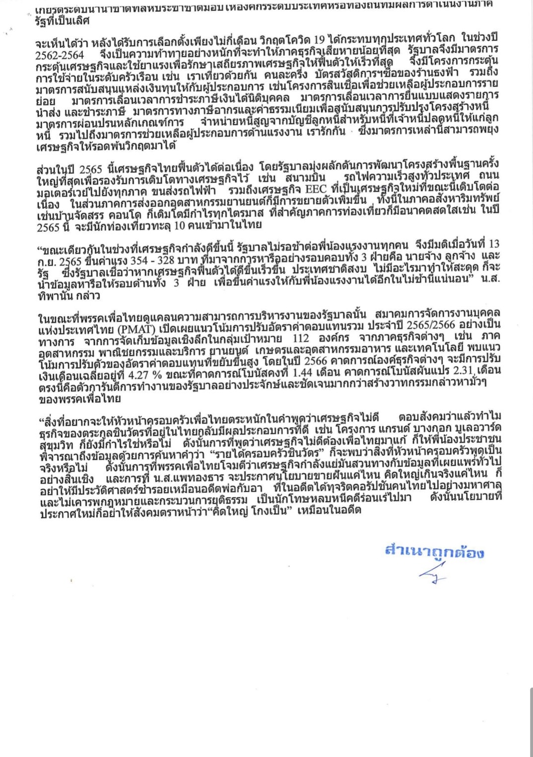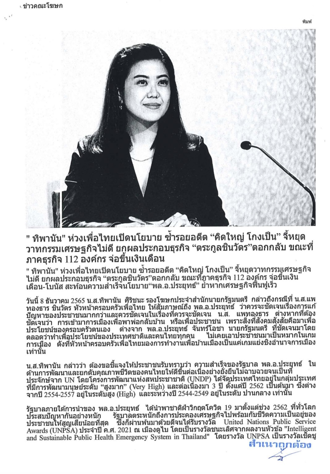 ซ้ำรอยอดีต คิดใหญ่ โกงเป็น จี้หยุดวาทกรรมเศรษฐกิจไม่ดี ยกผลประกอบธุรกิจตระกูลชินวัตร ตอกกลับขณะที่ภาคธุรกิจ 112 องค์กรจ่อขึ้นเงินเดือน’ โดยใช้ถ้อยคำในลักษณะที่ทำให้ผู้เห็นและอ่านข้อความ มีความเข้าใจว่าพรรคเพื่อไทยเป็นพรรคการเมืองที่ไม่ดี คิดทำนโยบายเรื่องใหญ่เพื่อหวังจะโกงหรือทุจริต ซึ่งล้วนเป็นความเท็จทั้งสิ้น พรรคเพื่อไทยจึงได้ร้องทุกข์กล่าวโทษต่อพนักงานสอบสวน