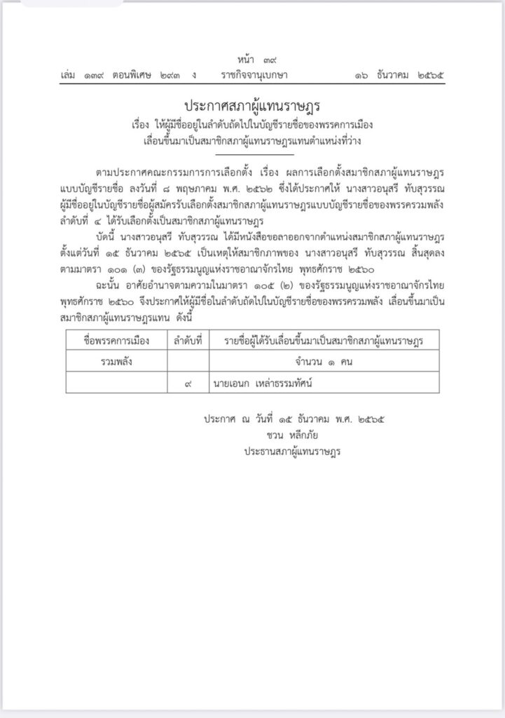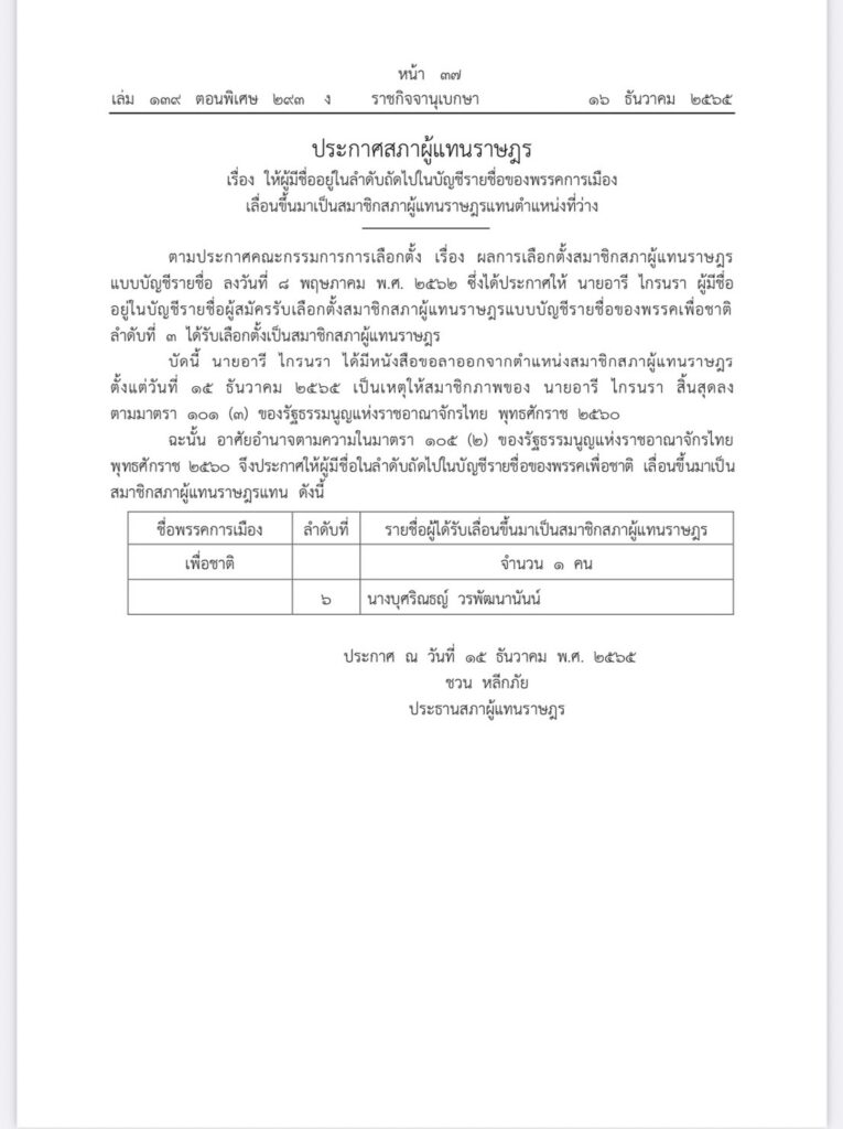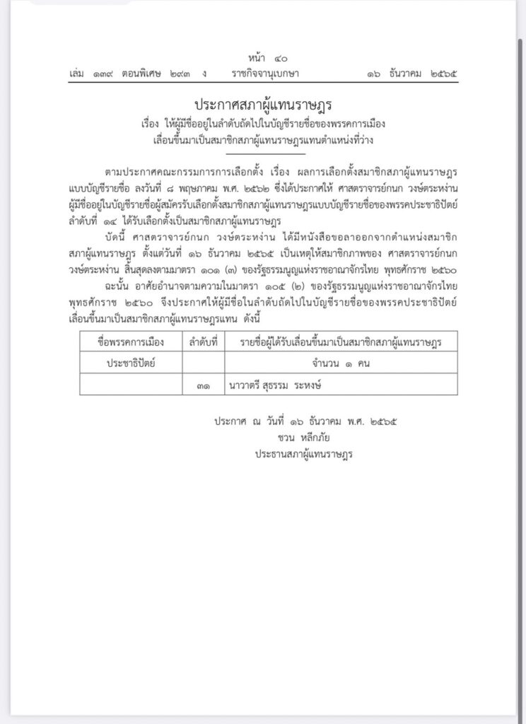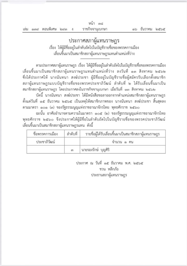 ราชกิจจานุเบกษา เผยแพร่ประกาศ สภาผู้แทนราษฎรเรื่องให้มีผู้มีชื่ออยู่ในลำดับถัดไปในบัญชีรายชื่อของพรรคการเมืองเลื่อนขึ้นมาเป็นสมาชิกสภาผู้แทนราษฎรแทนตำแหน่งที่ว่าง