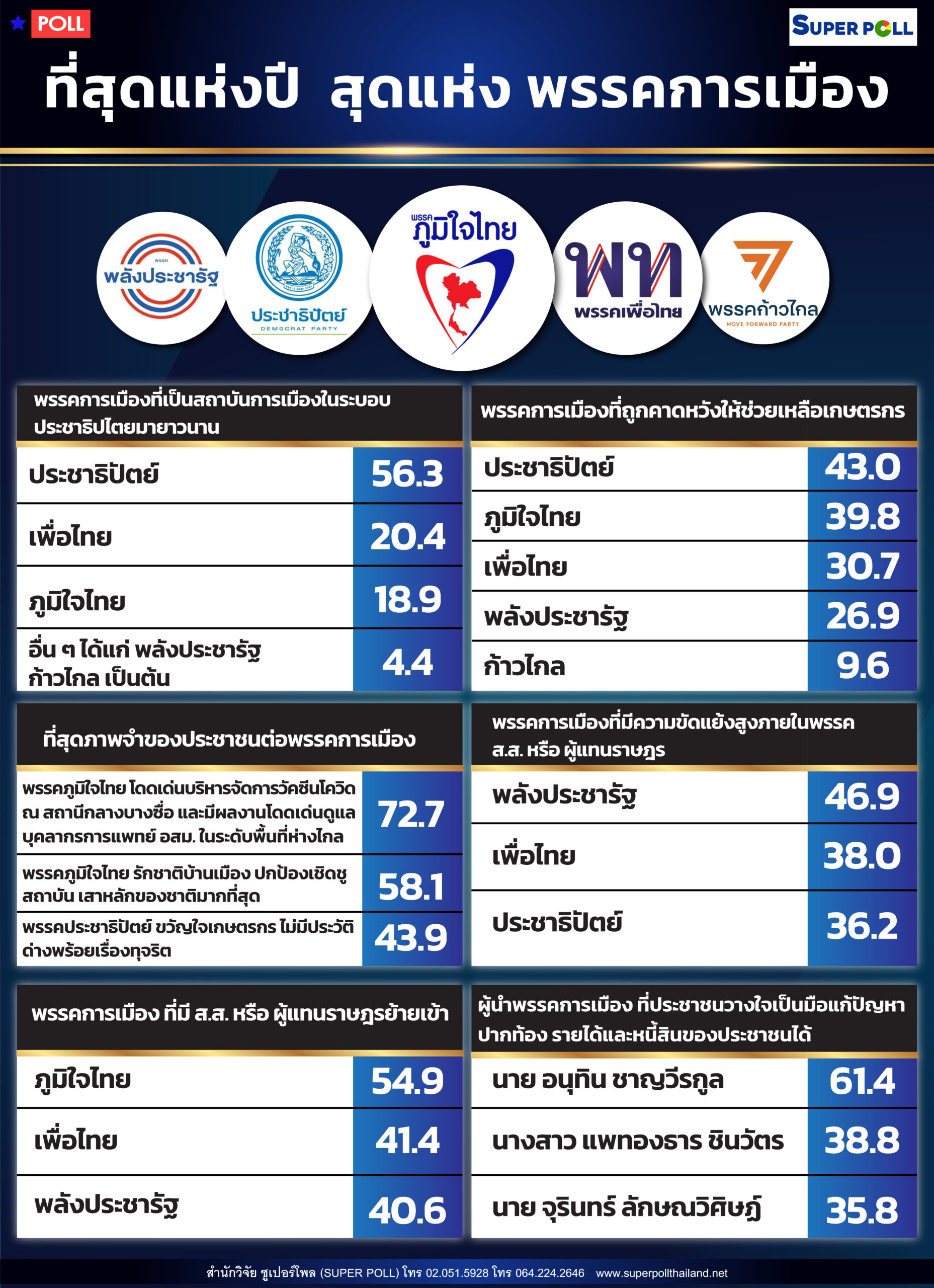 ซูเปอร์โพล (SUPER POLL)เผยผลสำรวจความคิดเห็นประชาชนทั่วประเทศจำนวน 1,190 ตัวอย่าง เรื่อง ที่สุดแห่งปี สุดแห่ง พรรคการเมือง ระหว่างวันที่ 14 – 17 ธันวาคม พ.ศ. 2565