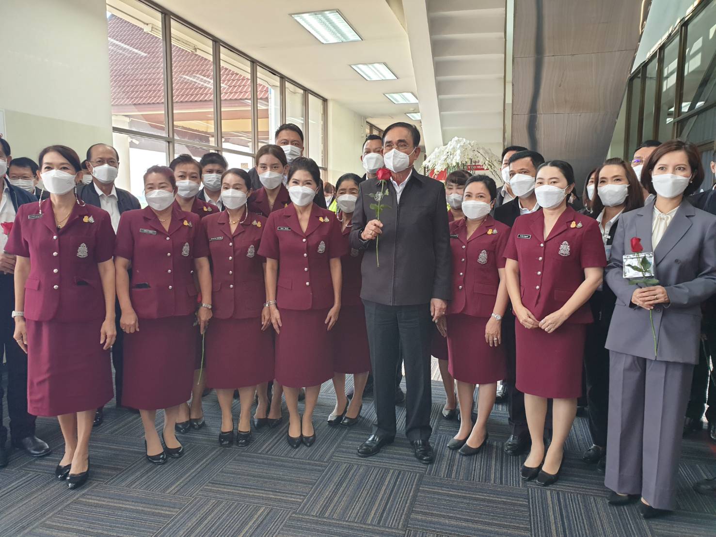 พล.อ.ประยุทธ์ จันทร์โอชา นายกรัฐมนตรี และรัฐมนตรีว่าการกระทรวงกลาโหม พร้อมคณะ เดินทางถึงท่าอากาศยานแม่ฟ้าหลวง อ.เมืองเชียงราย จ.เชียงรายโดยมี น.ส.ตรีนุช เทียนทอง รัฐมนตรีว่าการ?กระทรวงศึกษาธิการ ให้การต้อนรับ รวมถึงมีกลุ่มแม่บ้านตำรวจที่มารอรับ พร้อมมอบดอกกุหลาบสีแดงให้นายกรัฐมนตรีและคณะ โดยนายกรัฐมนตรี กล่าวว่า “ขอบคุณจ๊ะ กุหลาบแดงแทนใจ” พร้อมถ่ายรูปร่วมกัน
