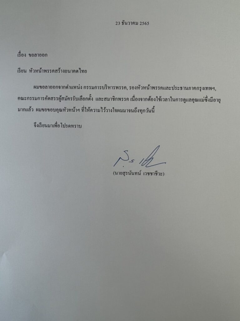 นายสุรนันทน์ เวชชาชีวะ รองหัวหน้าพรรคสร้างอนาคตไทย ได้ยื่นหนังสือลาออกลงวันที่ 23 ธันวาคม 2565 โดยระบุว่า ตนขอลาออกจากตำแหน่งกรรมการบริหารพรรค รองหัวหน้าพรรค และประธานภาคกรุงเทพฯ คณะกรรมการคัดสรรผู้สมัครรับเลือกตั้ง และสมาชิกพรรคเนื่องจากต้องใช้เวลาในการดูแลมารดาซึ่งมีอายุมากแล้ว ตนขอขอบคุณหัวหน้าพรรคที่ให้ความไว้วางใจมาจนถึงทุกวันนี้ อย่างไรก็ตามการลาออกจากการเป็นสมาชิกพรรคสร้างอนาคตไทยของนายสุรนันท์ คาดว่าจะย้ายมาร่วมงานกับพรรครวมไทยสร้างชาติ