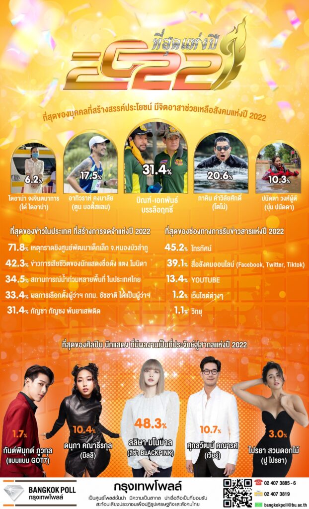 “กรุงเทพโพลล์” ที่สุดแห่งปี 2022 “กราดยิงหนองบัวลำภู”สร้างการจดจำมากที่สุด, ศิลปินผลงานประจักษ์ที่สุด “ลิซ่า แบล็คพิงค์” ขณะ “บิณฑ์-เอกพันธ์”จิตอาสาช่วยเหลือสังคมที่สุด