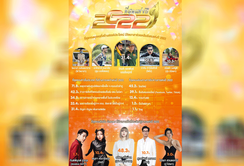 เมื่อถามว่าได้รับข่าวหรือสถานการณ์ในประเทศ ผ่านช่องทางใดมากที่สุดในปี 2022 ร้อยละ 45.2 ระบุได้รับผ่านโทรทัศน์, ร้อยละ 39.1 ได้รับผ่านสื่อสังคมออนไลน์ เช่น Facebook,Twitter, Tiktok, Line และร้อยละ 13.4 ได้รับผ่าน Youtube, ผู้มีชื่อเสียง ศิลปิน นักแสดง สร้างสรรค์ประโยชน์ มีจิตอาสาช่วยเหลือสังคมที่สุดแห่งปี 2022 ร้อยละ 31.4 บิณฑ์-เอกพันธ์ บรรลือฤทธิ์ ร้อยละ 20.6 ภาคิน คำวิลัยศักดิ์ (โตโน่) และร้อยละ 17.5 อาทิวราห์ คงมาลัย (ตูน บอดี้สแลม)